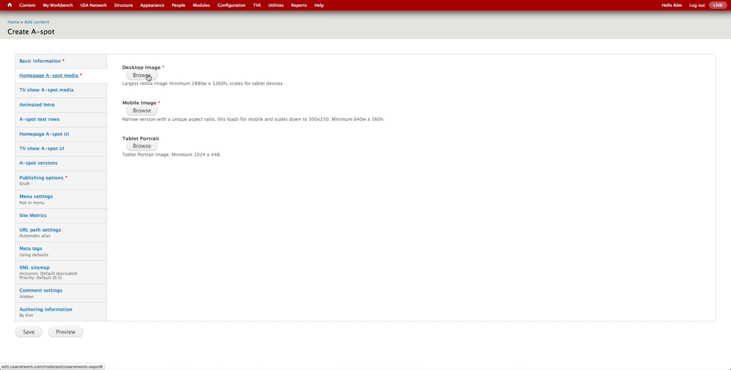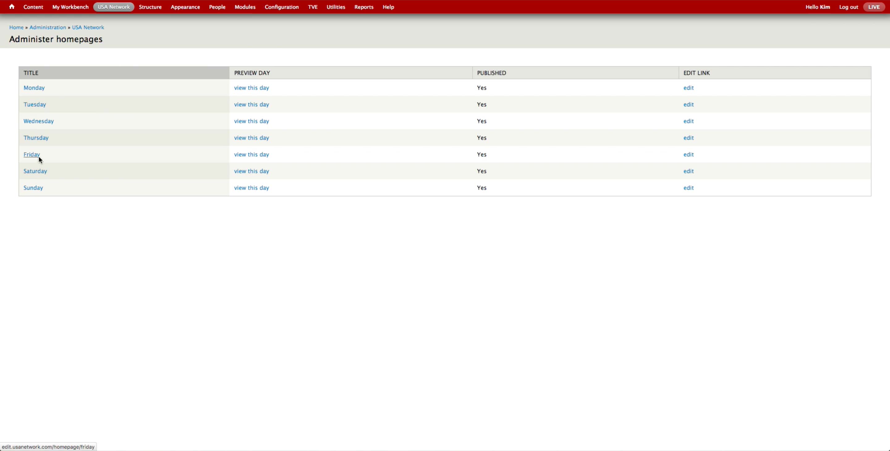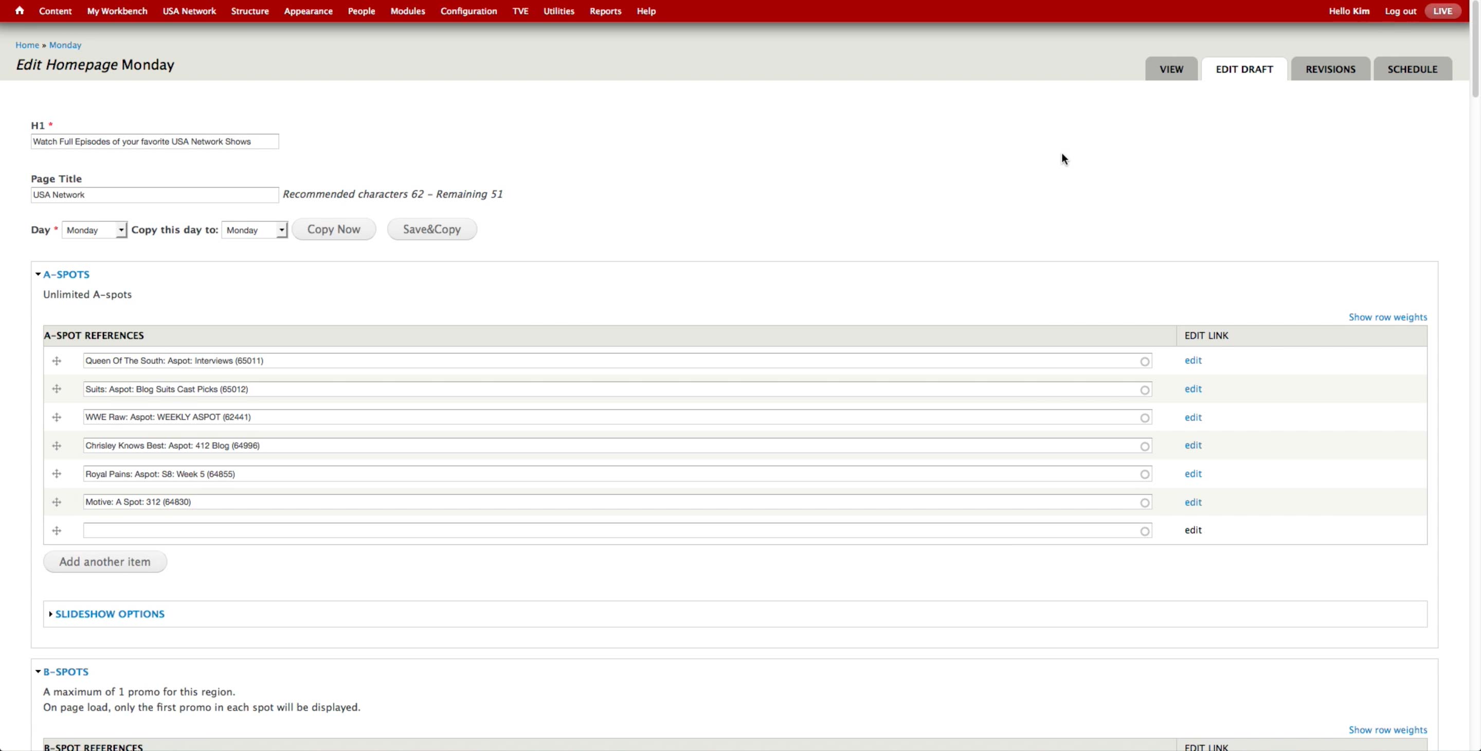 Once all the A-spots are created, the producer goes to USA Network > Administer USA Homepage and hit edit button of the corresponding day.
