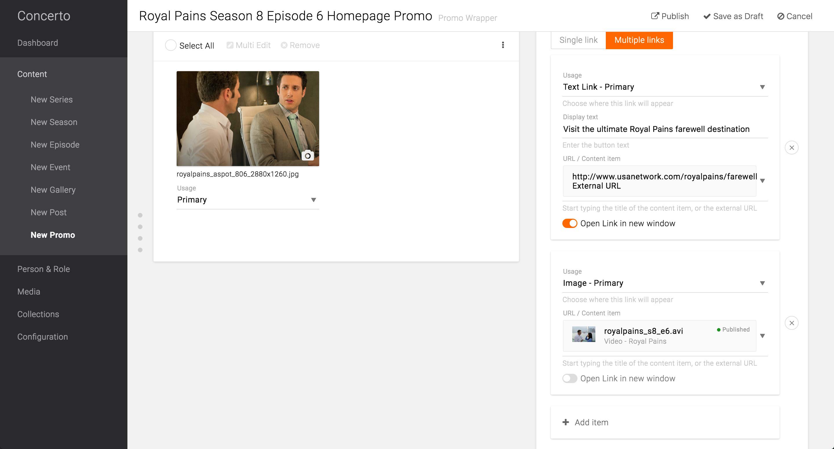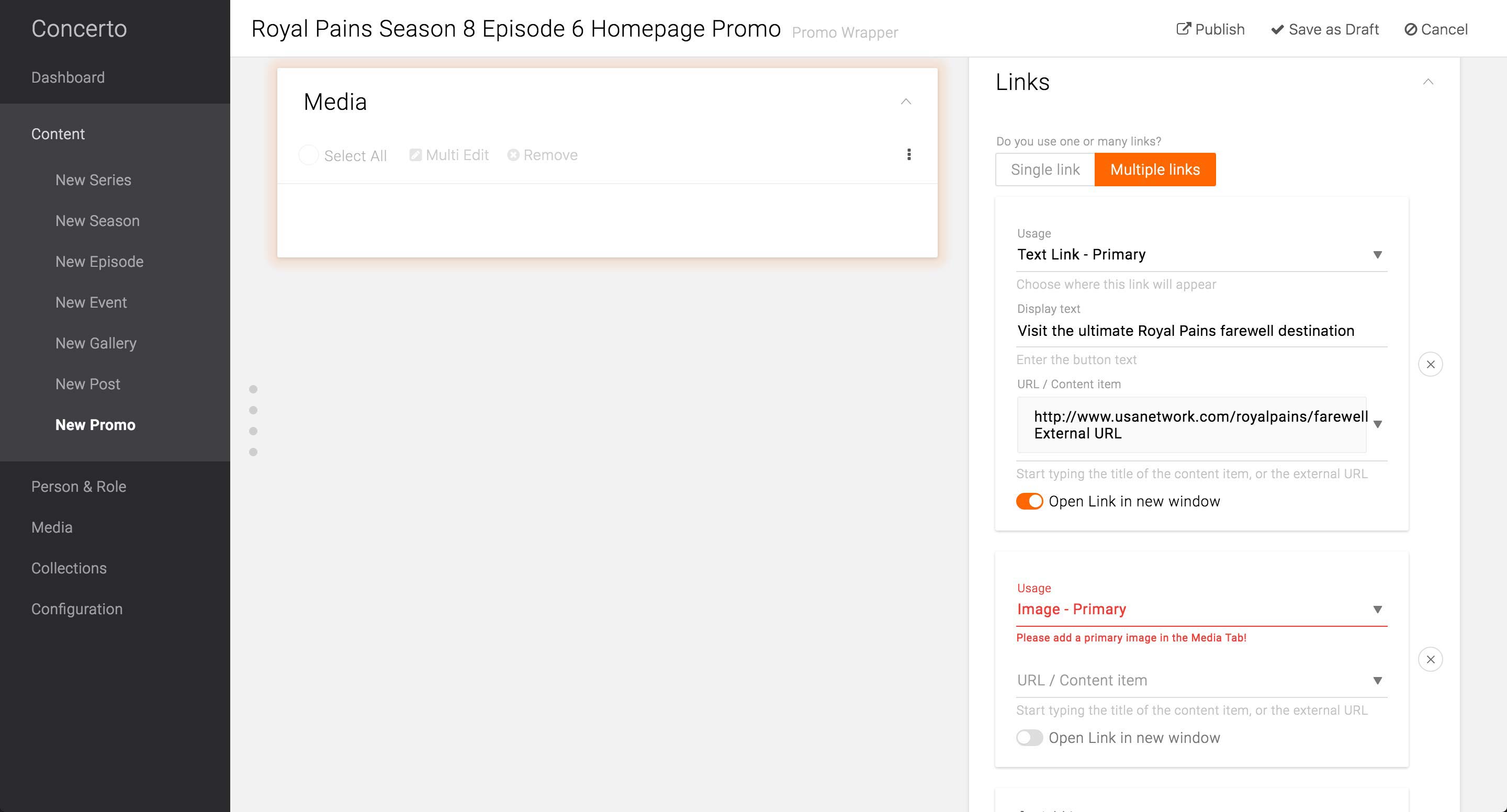 In the case the Promo only holds a single call-to-action button, producer can choose Single link option and enter the appropriate label for the button. In the URL / Content item field, she can either choose from the existing content type or enter a URL for the button to link to. There is also an option to select to open the link in new window.