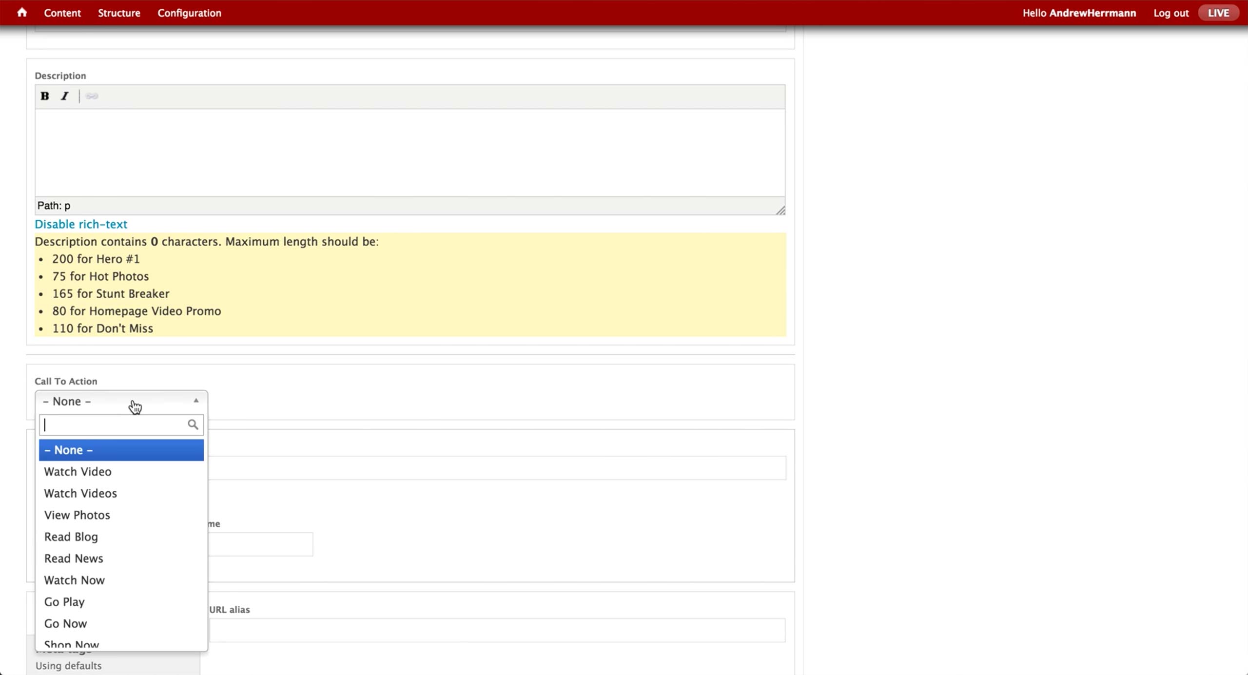 Below, there are text areas for each item to enter the text that will appear on the A-spot. Producer may add additional call-to-action buttons, up to 3. They usually create up to 2, as the front-end UI doesn’t look good with 3.