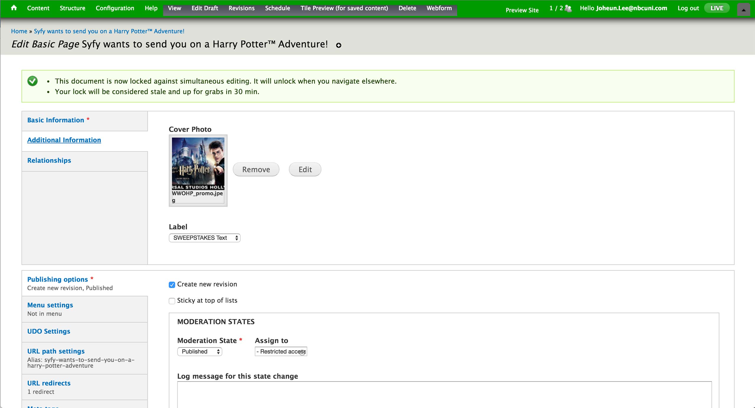 In the Additional Information tab, producer can set the cover photo that appears at the top of the page, as well as the Label that appears above title text. Labels are all pre-defined, and most used labels are SWEEPSTAKES and INFO.