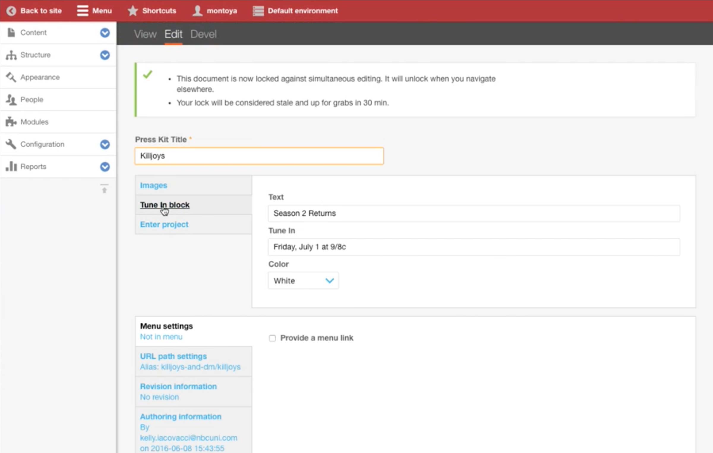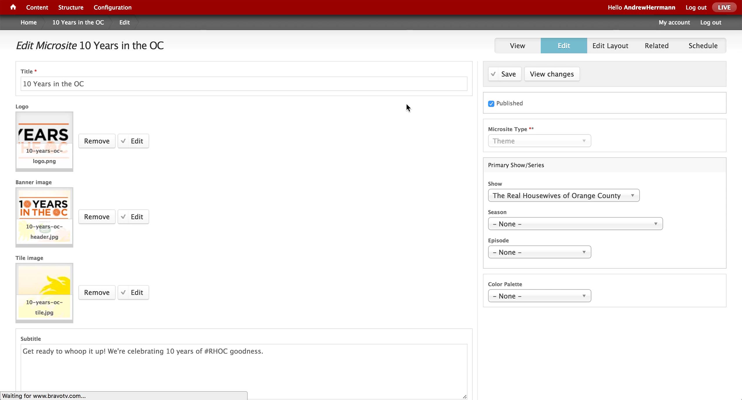 This is the Basic Information screen for Microsite Content Type. Developers would pre-configure the Theme and Base Path fields and hand the node to the producer. A microsite is typically on a single TV show, and producer makes the association in the Show dropdown.