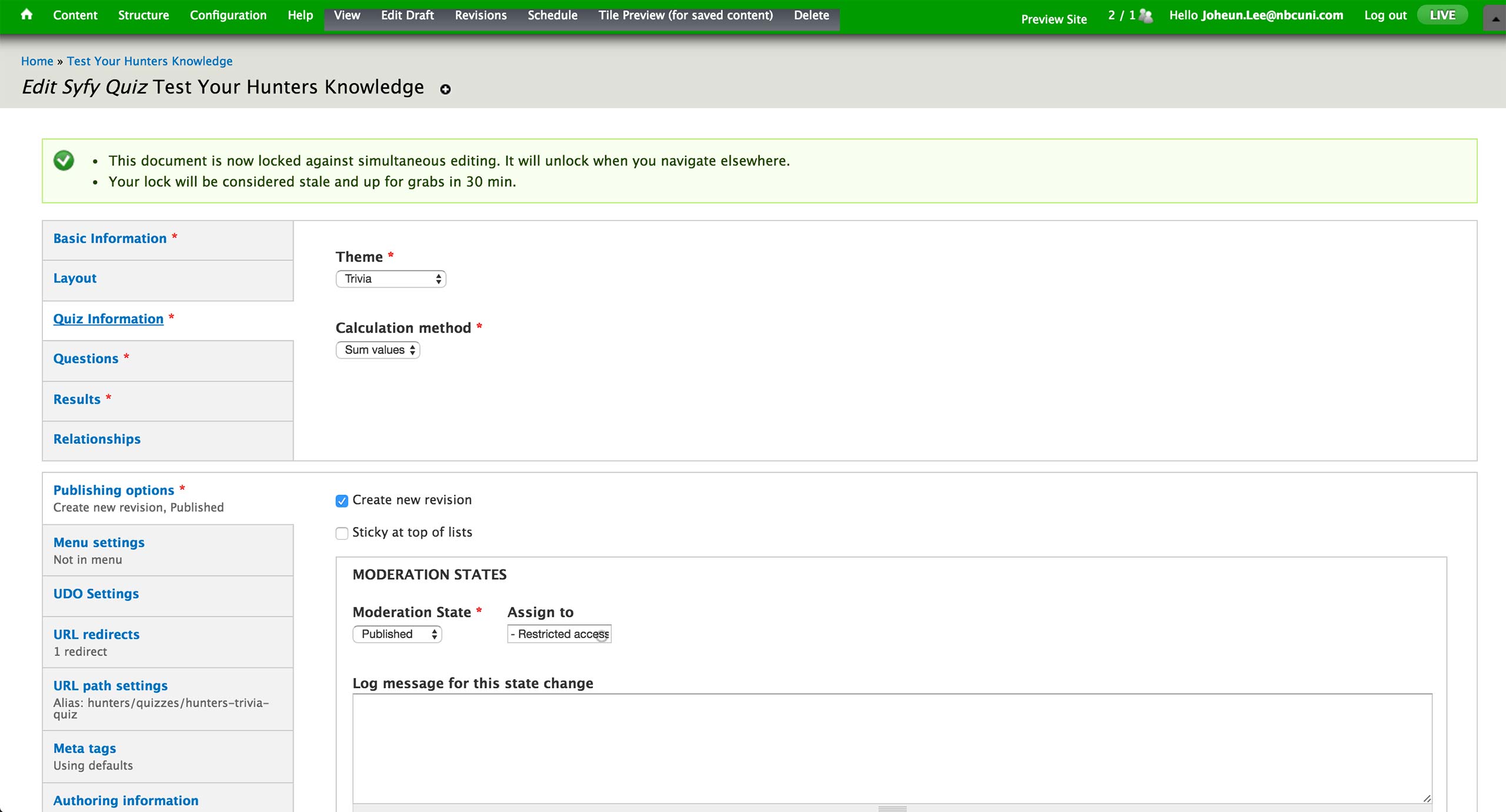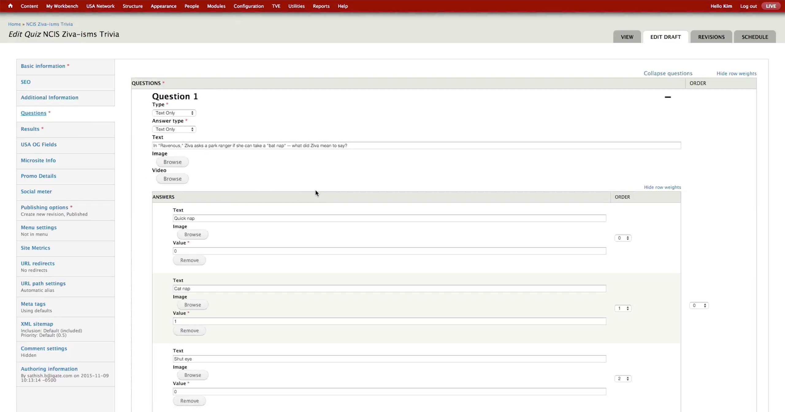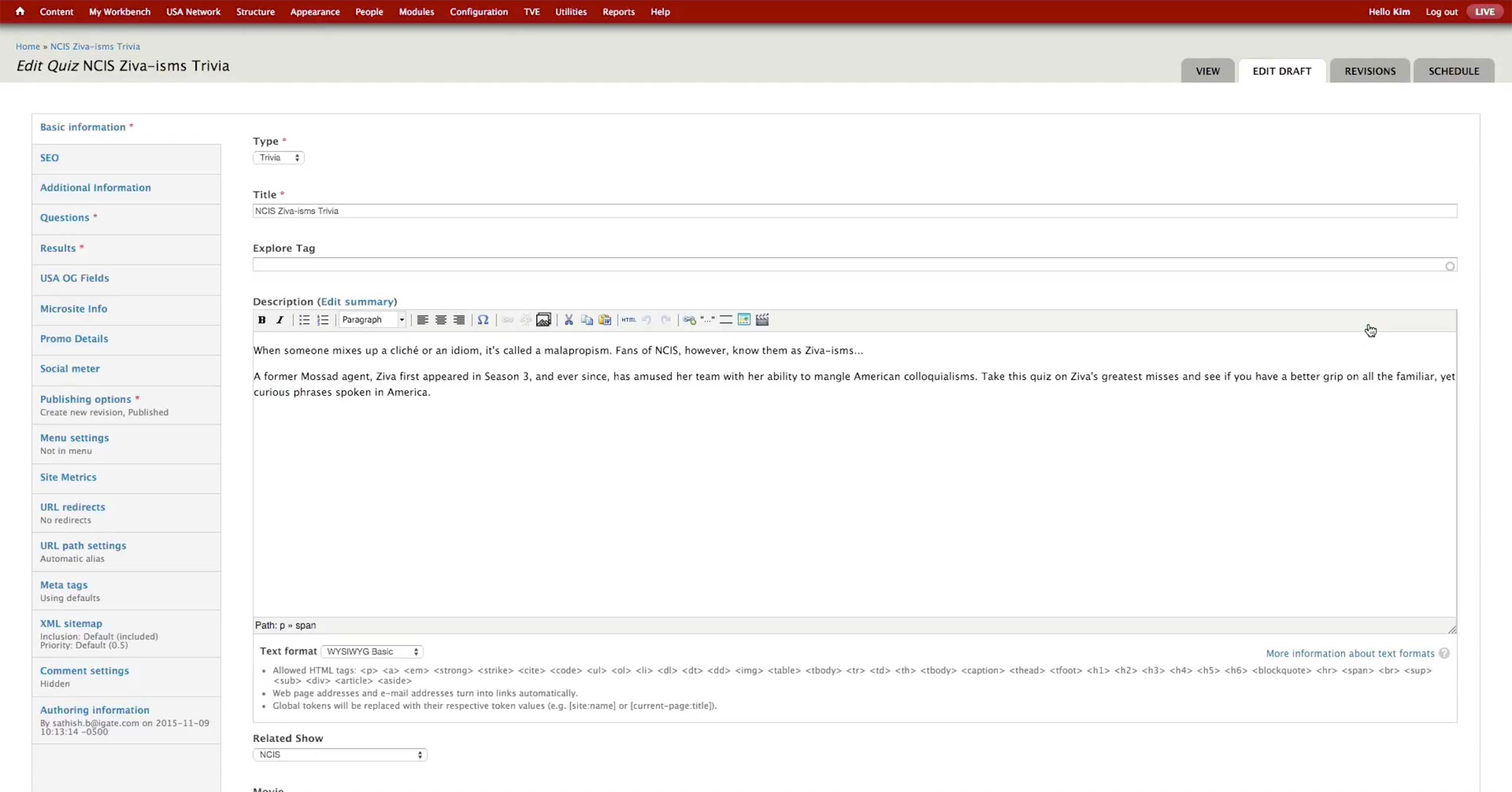 To create a quiz, producer selects to create new Syfy Quiz Content Type. In the Basic Information tab, he sets the title, category, image, and synopsis of the quiz. There are Trivia and Personality quizzes under the Category dropdown. Category, Image and Synopsis appear on the landing page of the quiz.