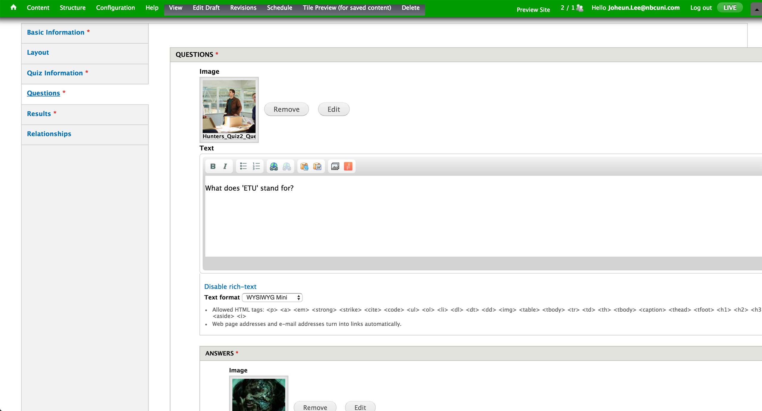 Under Questions tab, producer can add as many questions as they want; but there are usually 10 questions so that the result would be out of 100 points, 10 points per correct answer. Each question features an image and accompanying text.