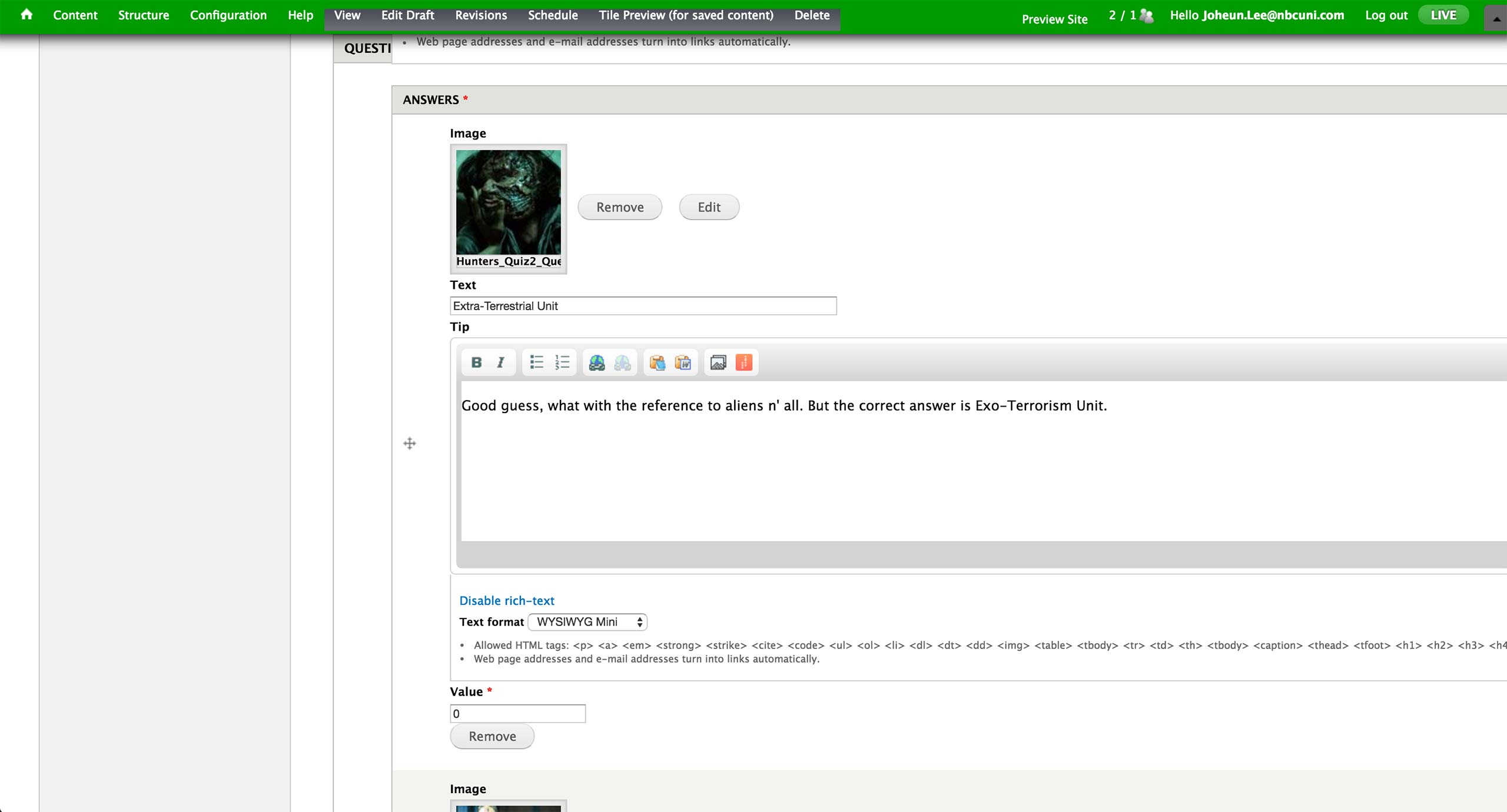 In Bravo, quizzes are powered by a 3rd party service called PlayBuzz. The embed code for the quiz simply gets pasted into a separate Game Content Type.