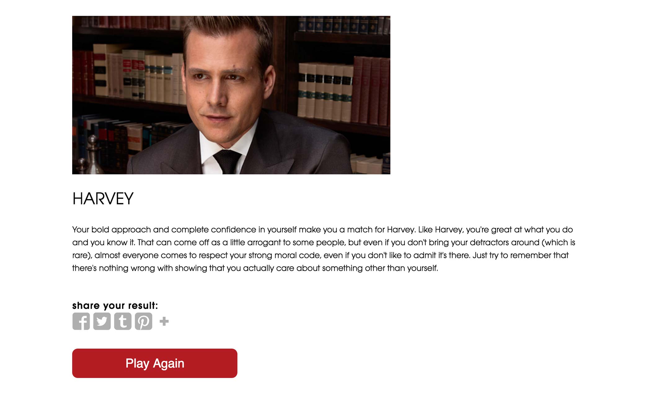 At the end of the quiz, the user sees the result of the quiz, whether it be a score or a character’s profile.