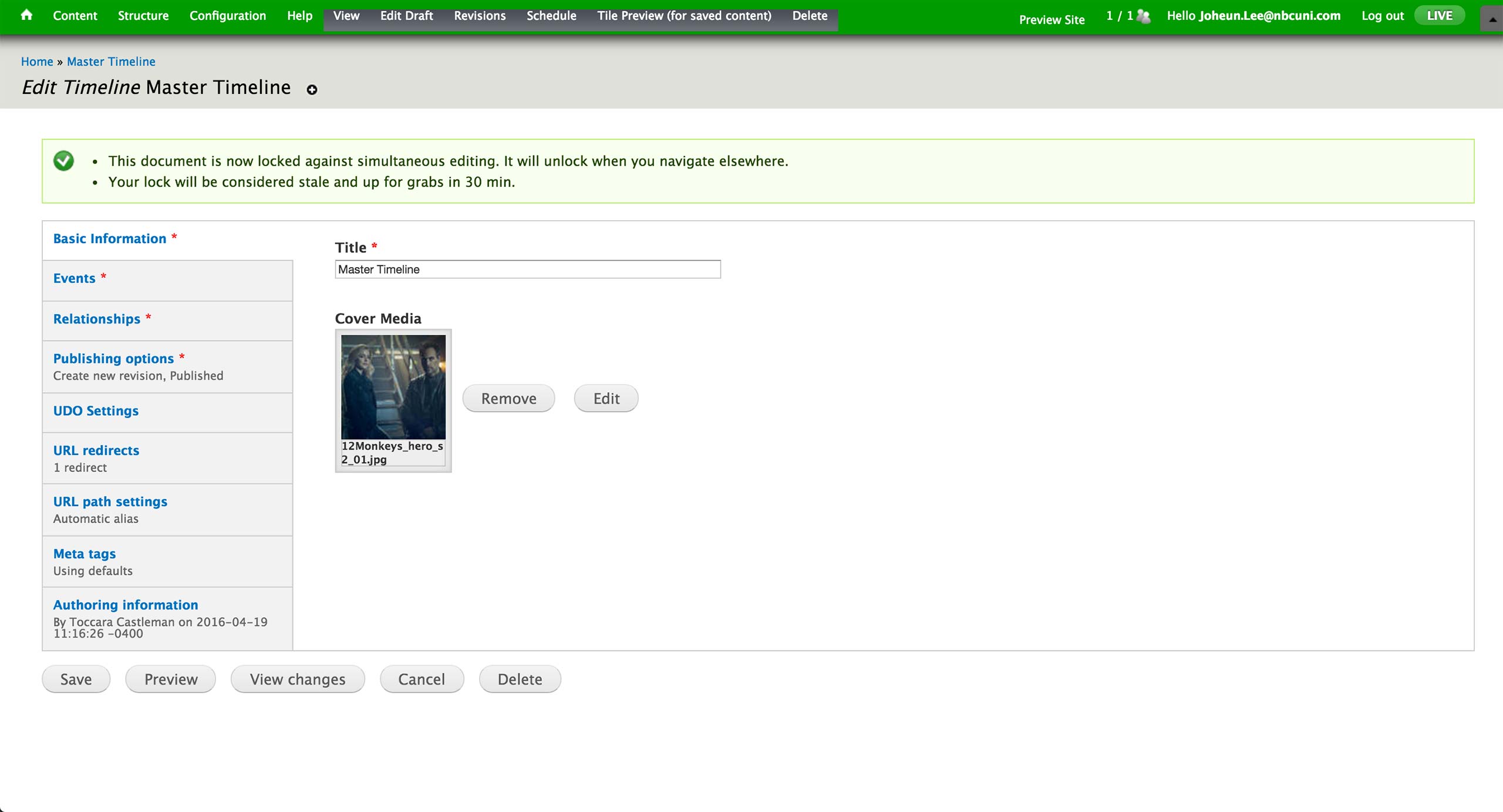 This is the initial screen of the Timeline Content Type. Here, producer sets the title and the cover image of the timeline.
