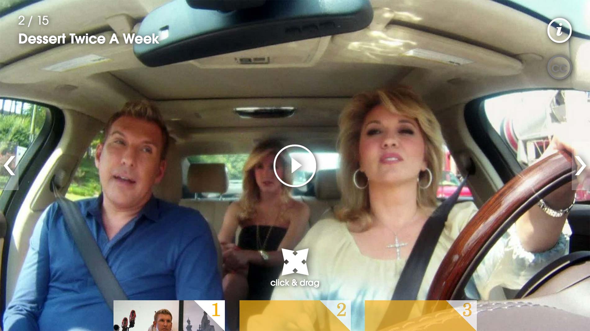 Timeline Gallery shows events from a show in chronological order of the episodes. Content is consisted of text and an image or a video, and user can use the arrows or the bottom navigation to jump through the scenes and episodes.