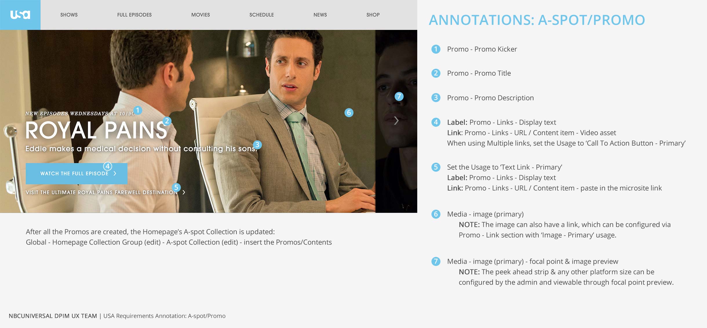 Producers create A-spots for the homepage and show’s landing pages. They set which elements to display as well as where on the image those elements will go.