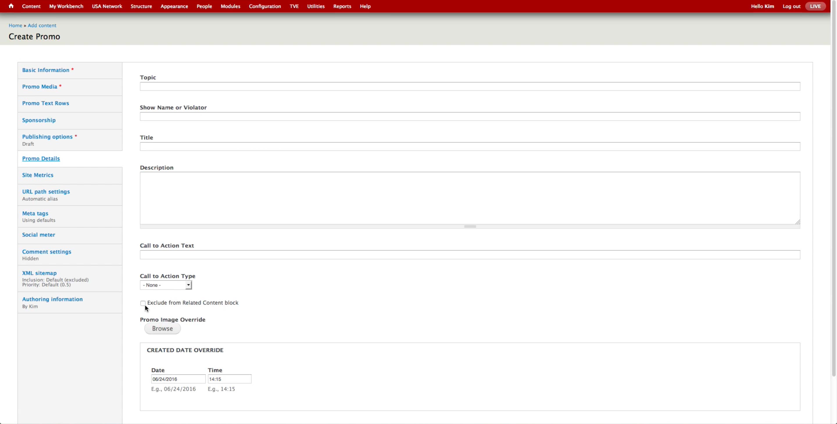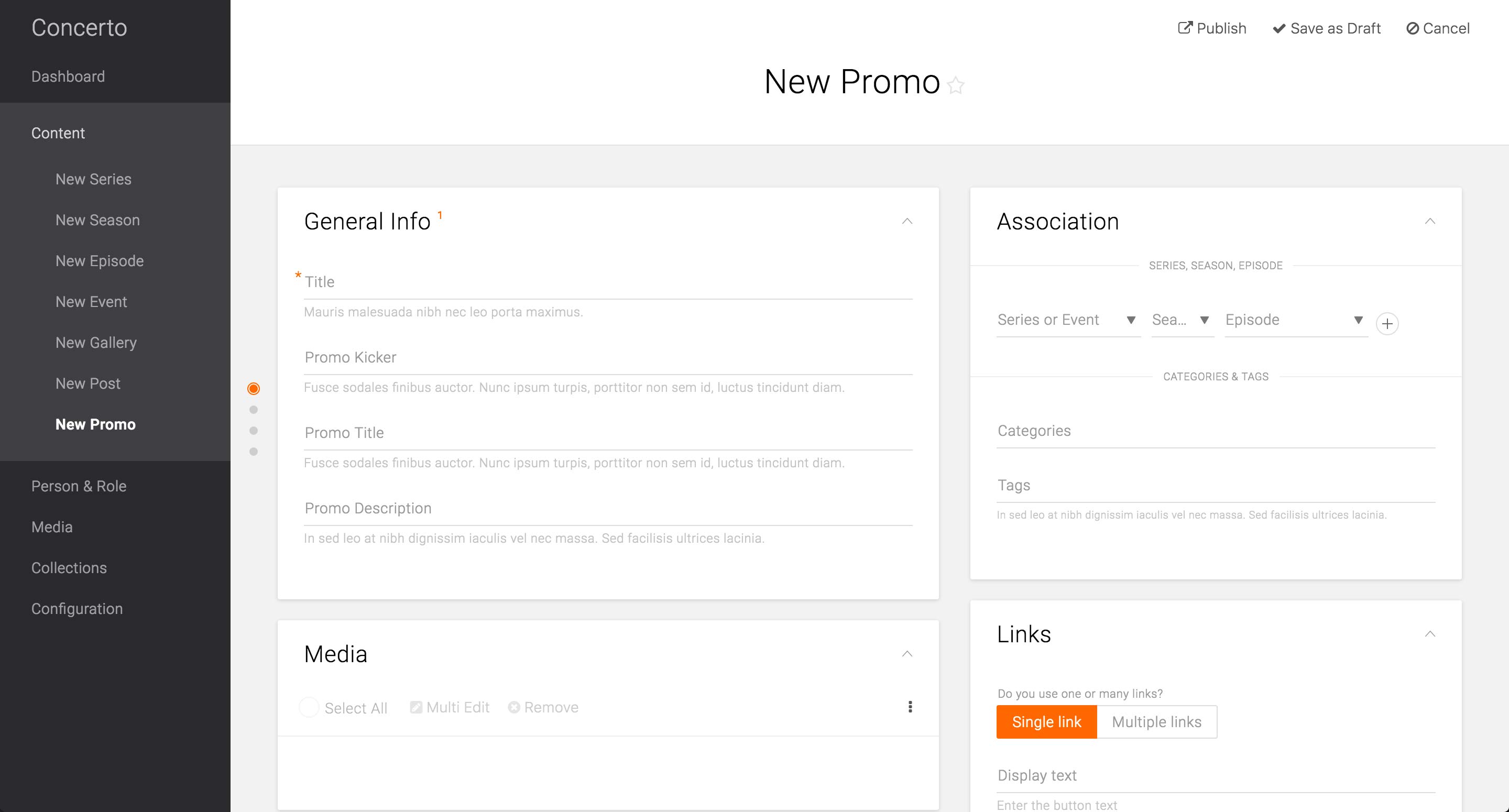 In addition to the required Title field, Association card, and Media card that are common across the Content Types, Promo Content Type has a Kicker field, which is often displayed above the title of the promoted content.