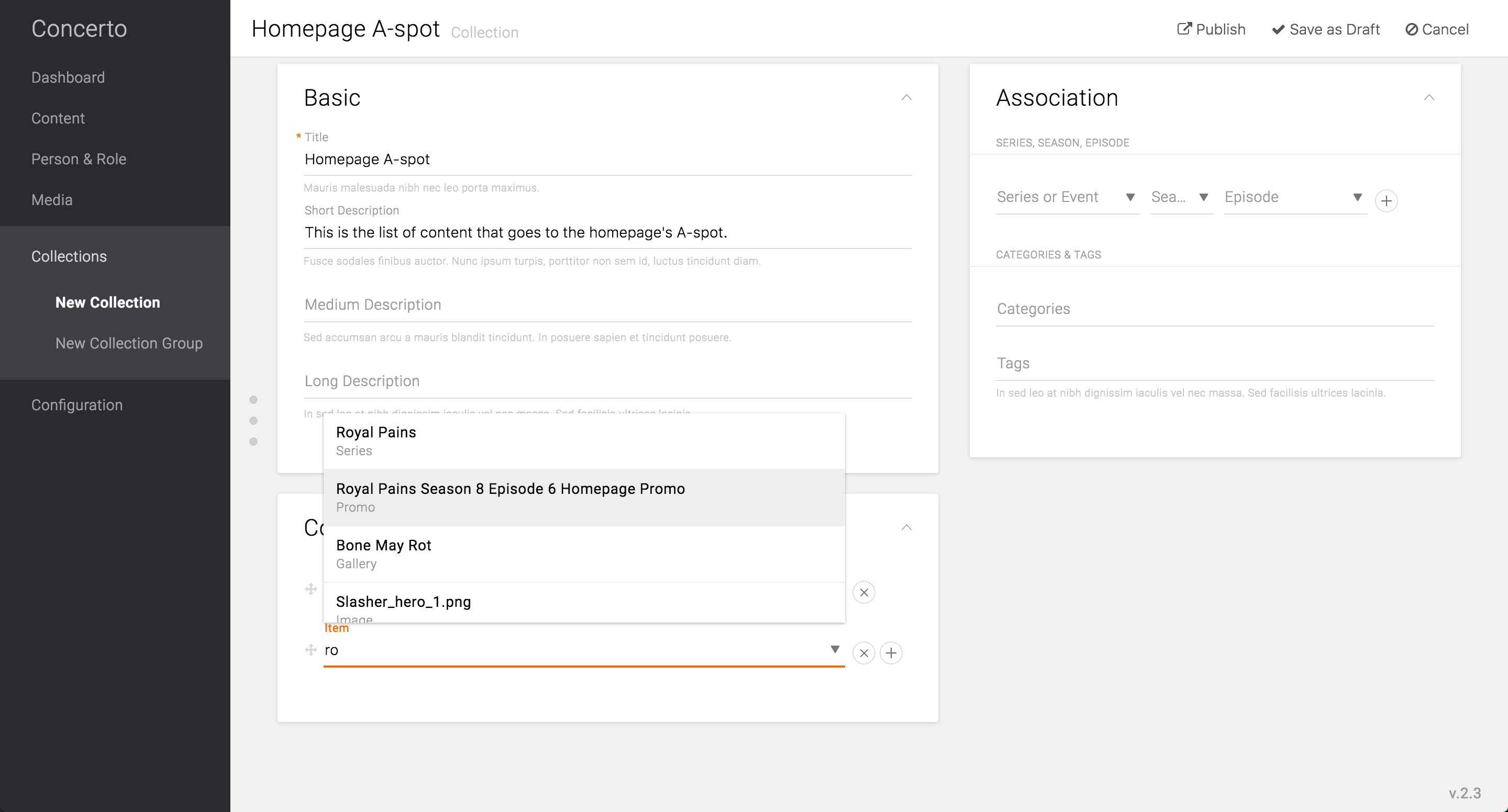 Going into the edit screen of the Homepage’s A-spot Collection, the producer can choose the Promo Wrapper by start typing the title.