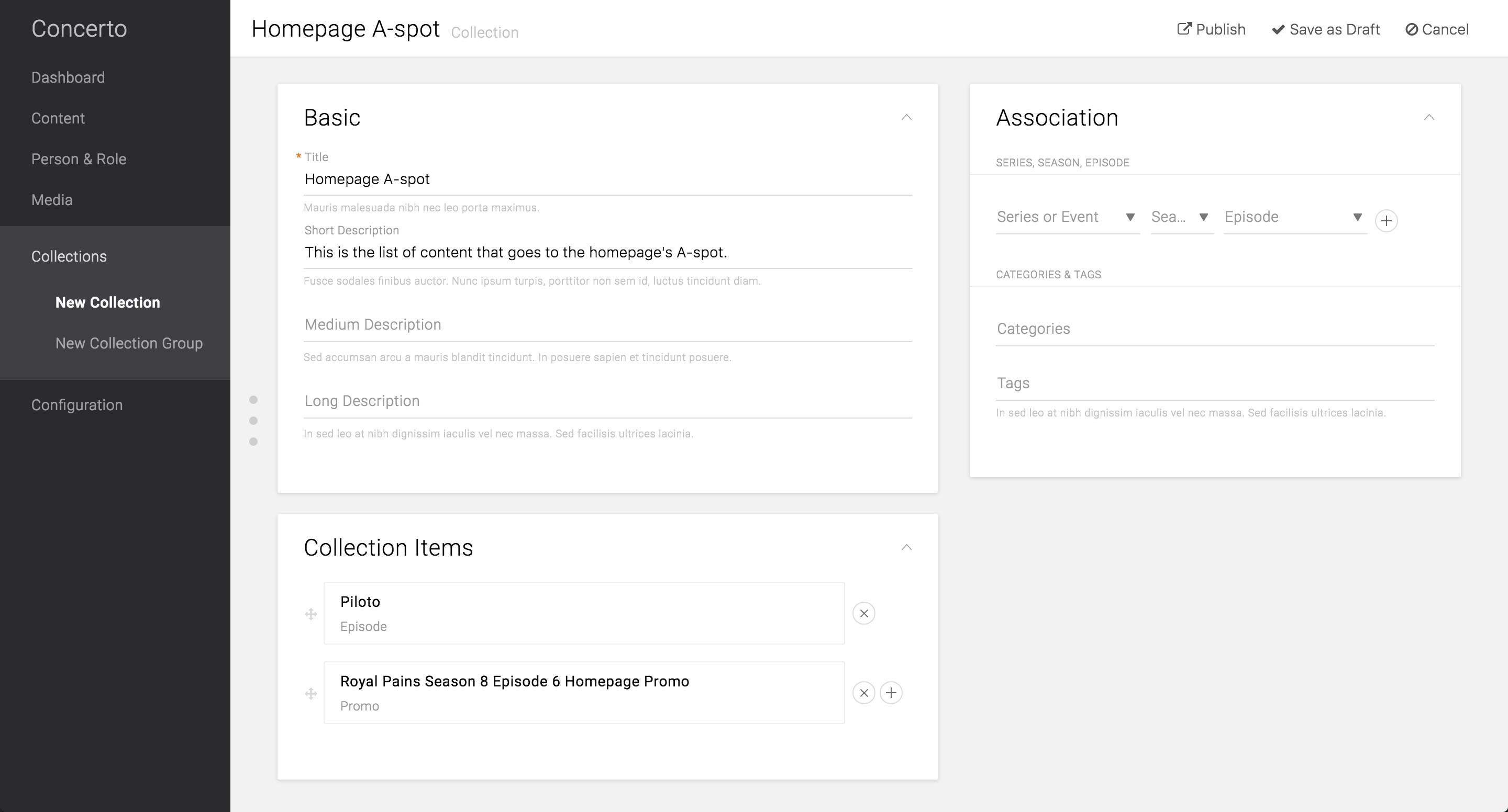 1. Each item can be scheduled to go into/removed from the Collection. This option reuses the “Homepage A-spot” Collection and reduces the number of Collection that lives on the CMS. The downside of this is that the producers can’t reuse the Collection that was previously up on the site. Use case of this case, however, would be very minimal, if any.