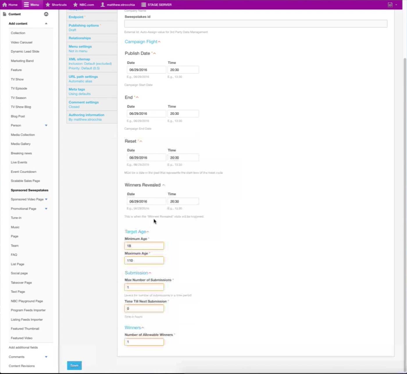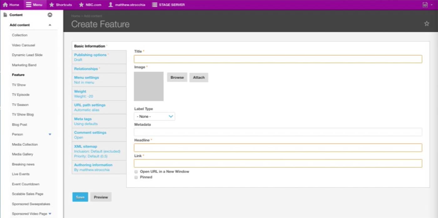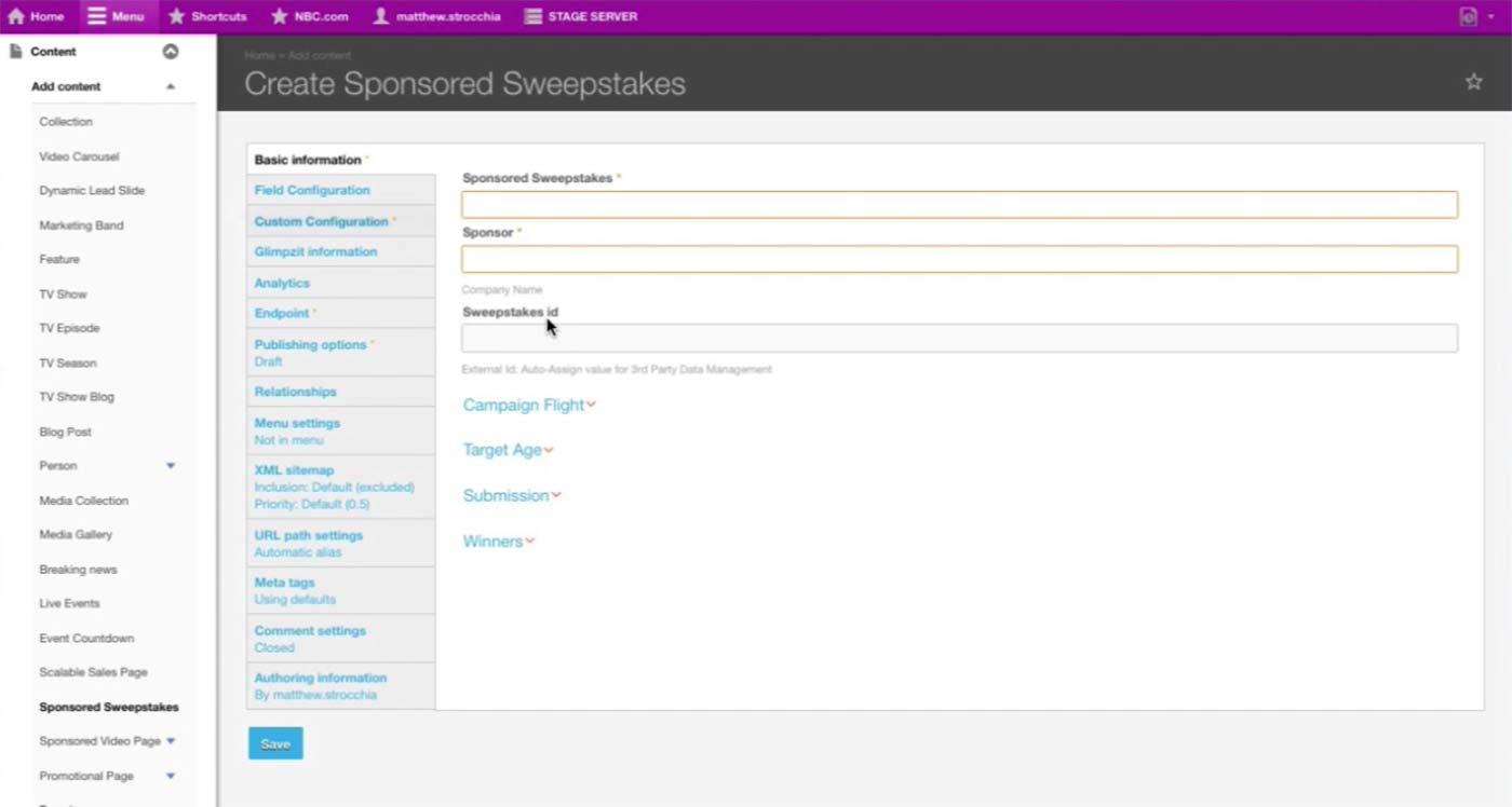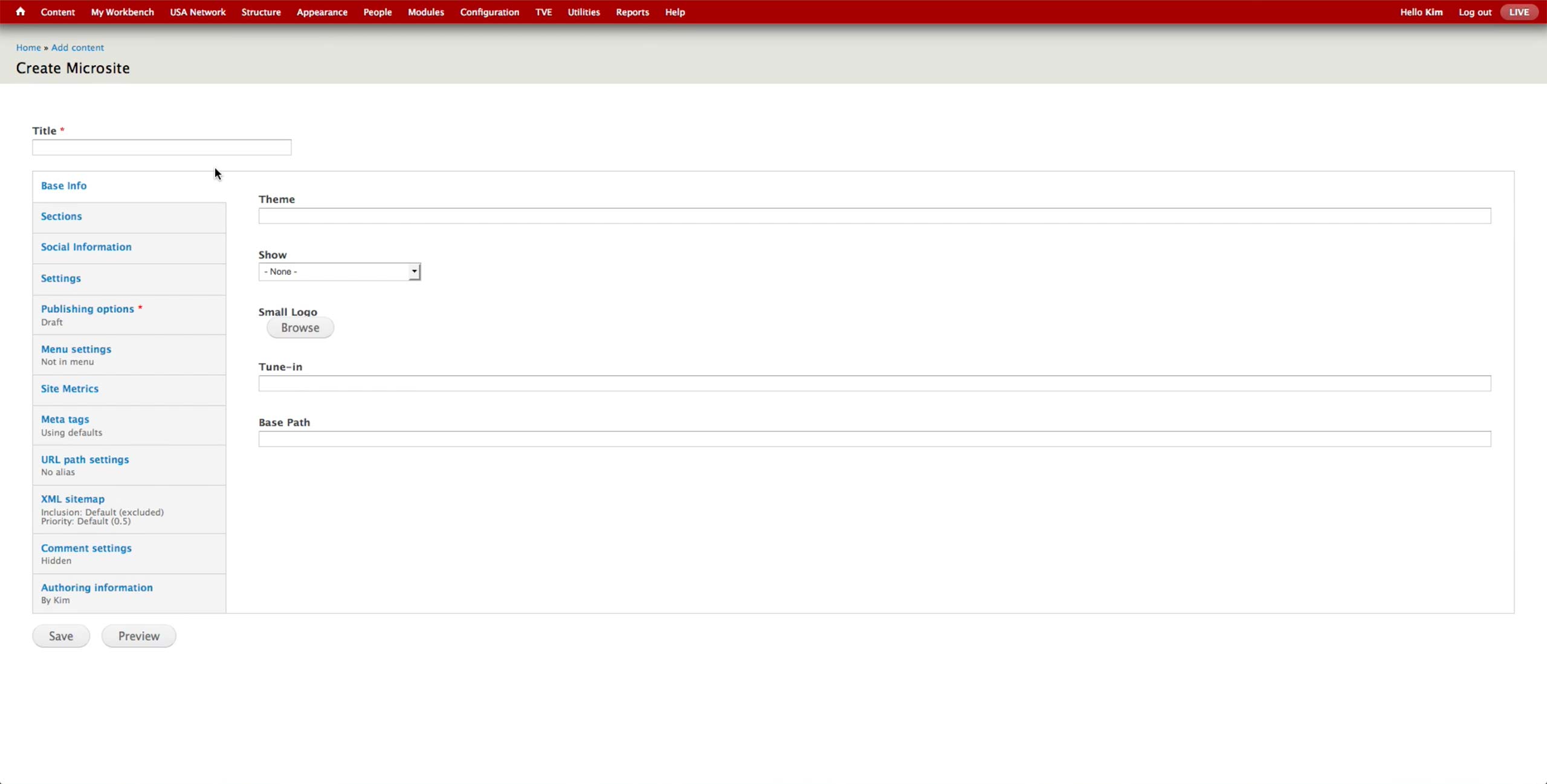 This is the Basic Information screen for Microsite Content Type. Developers would pre-configure the Theme and Base Path fields and hand the node to the producer. A microsite is typically on a single TV show, and producer makes the association in the Show dropdown.
