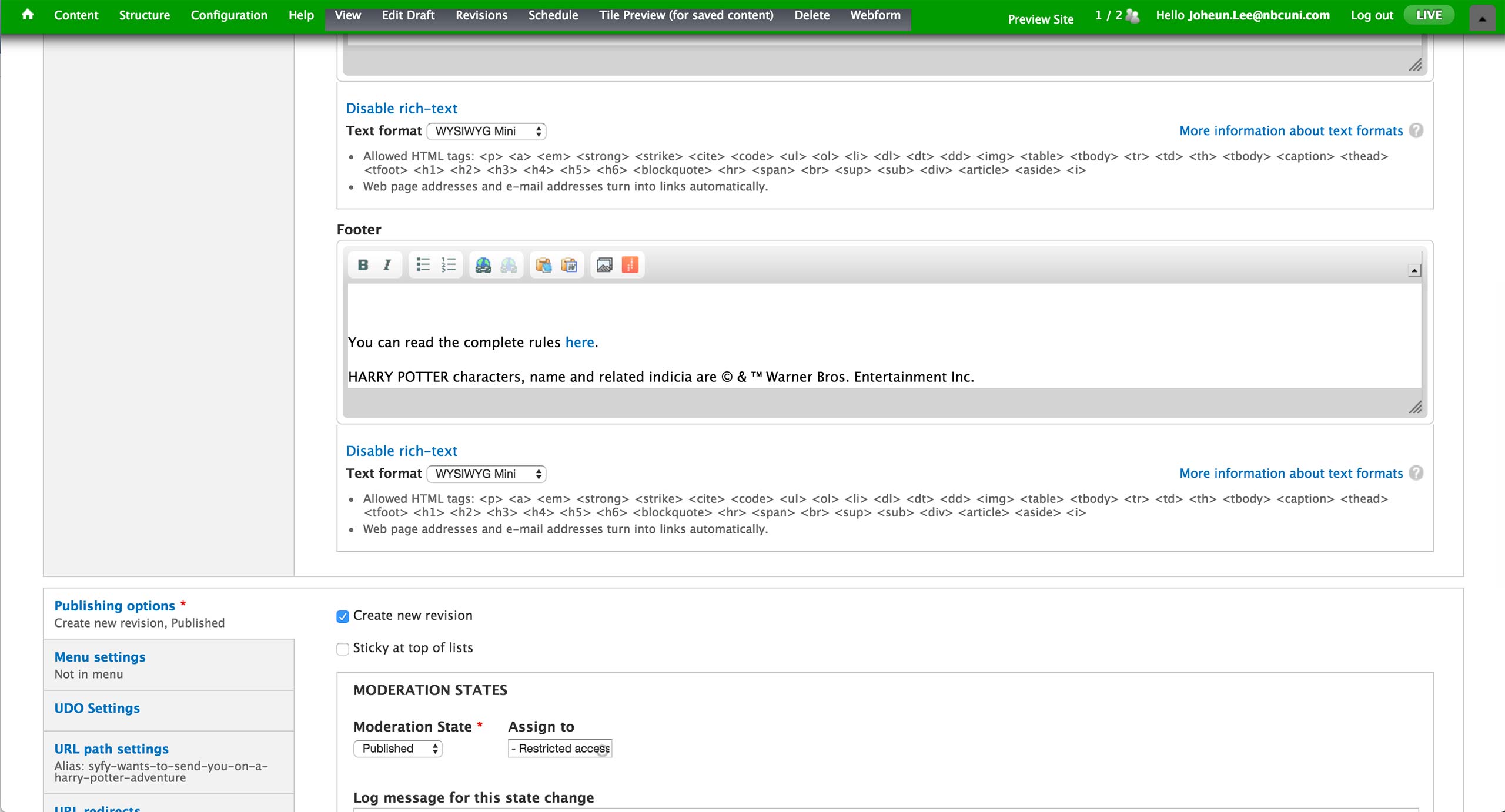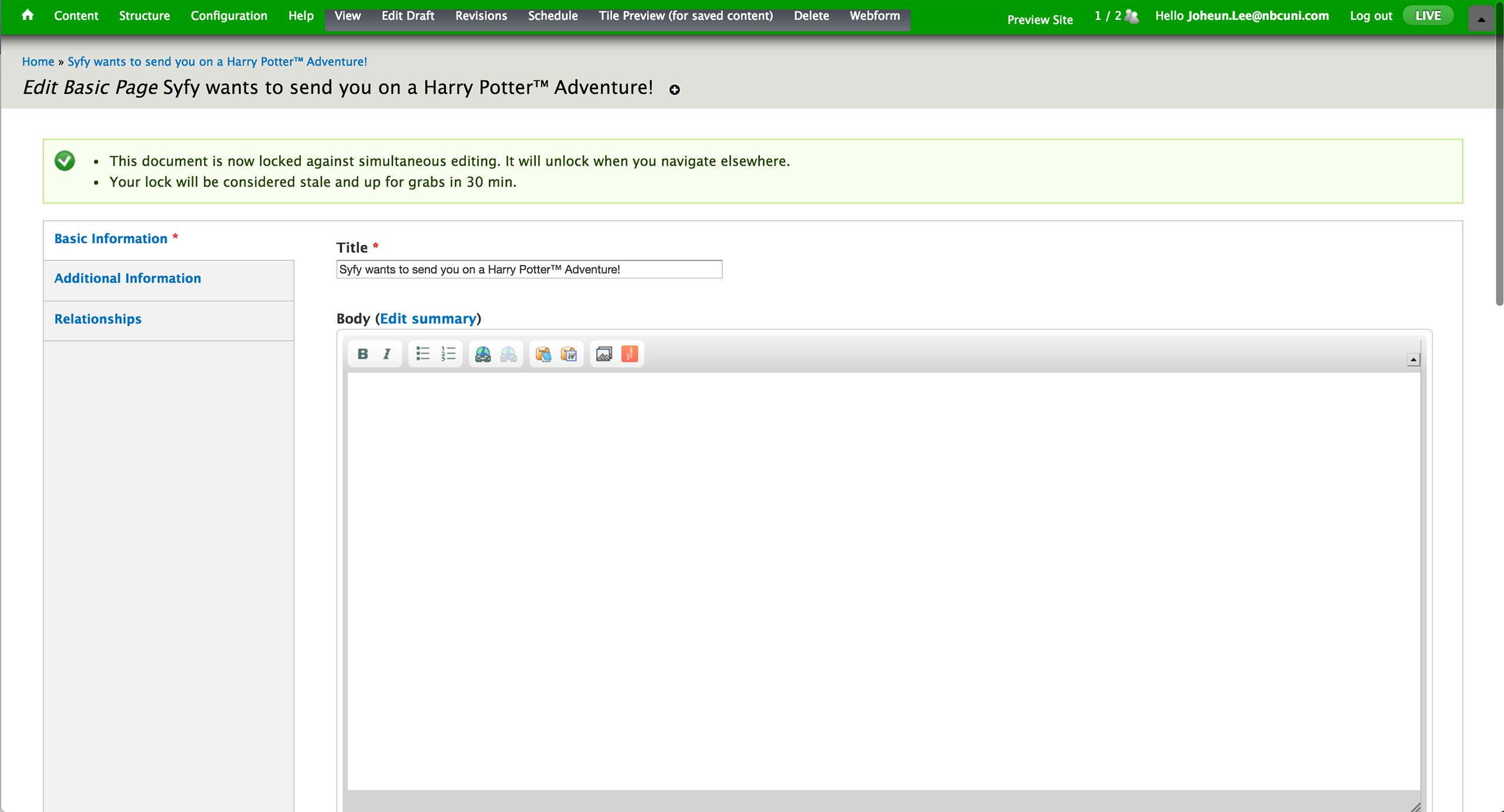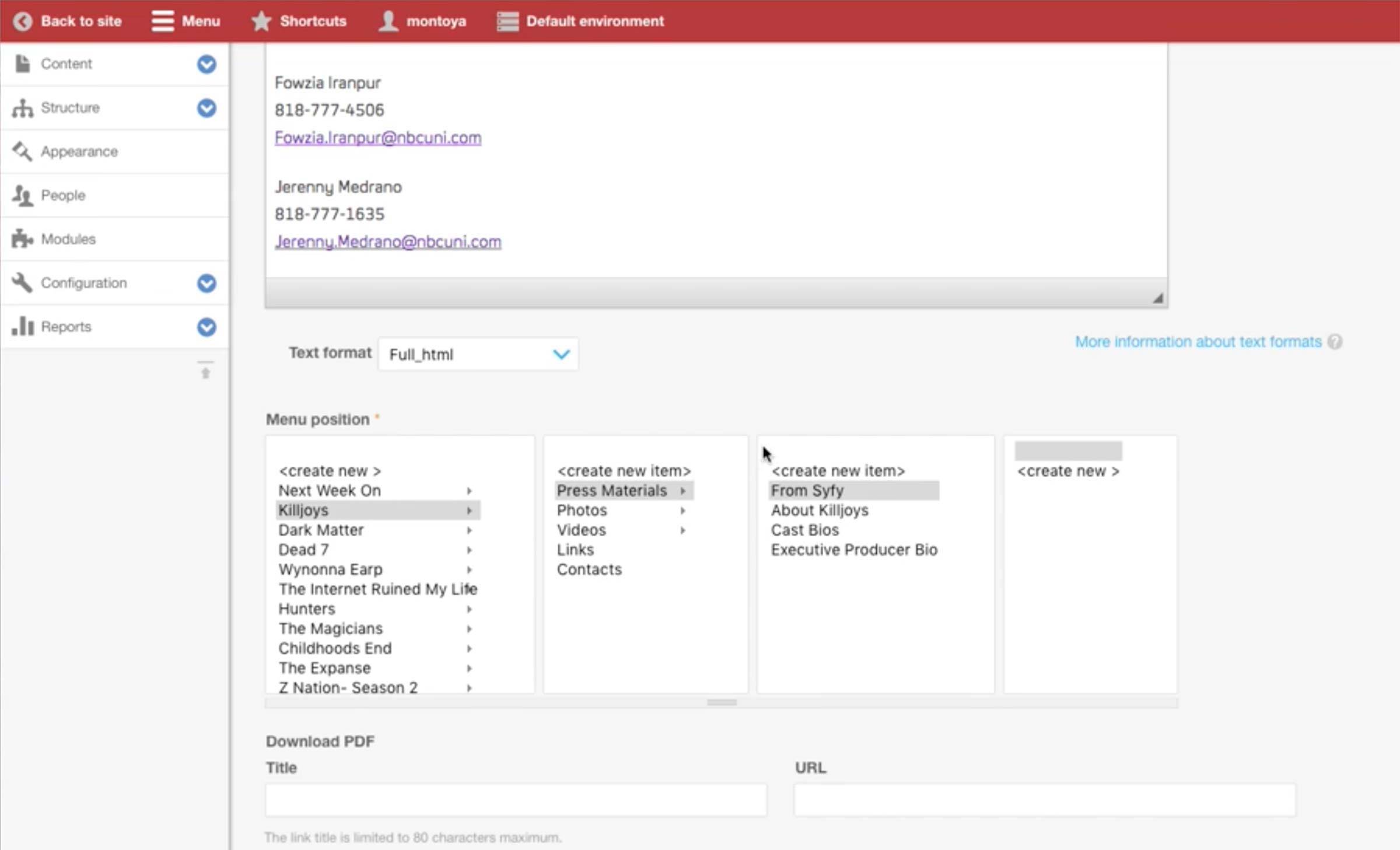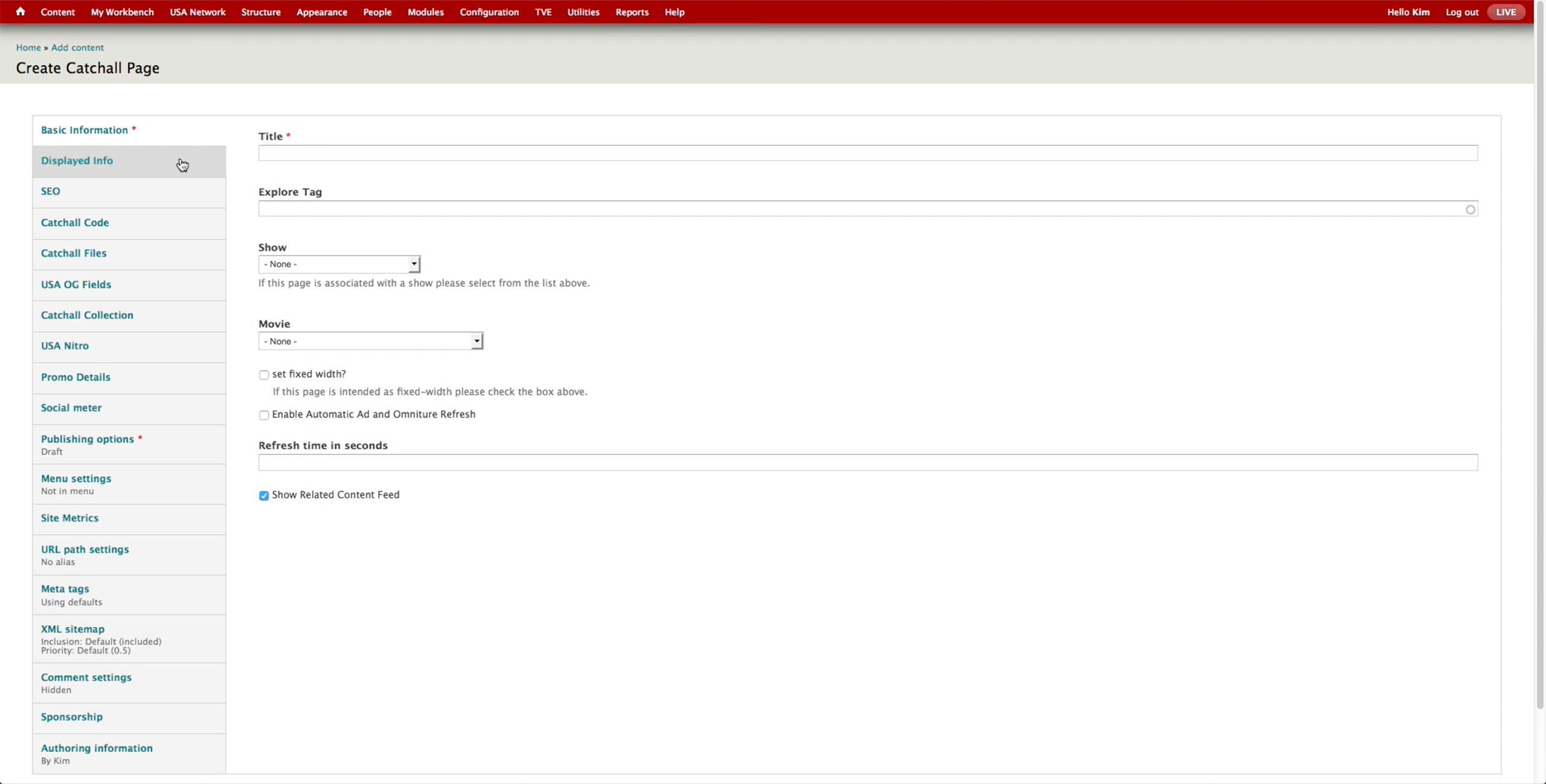 This is the Basic Information screen for Microsite Content Type. Developers would pre-configure the Theme and Base Path fields and hand the node to the producer. A microsite is typically on a single TV show, and producer makes the association in the Show dropdown.