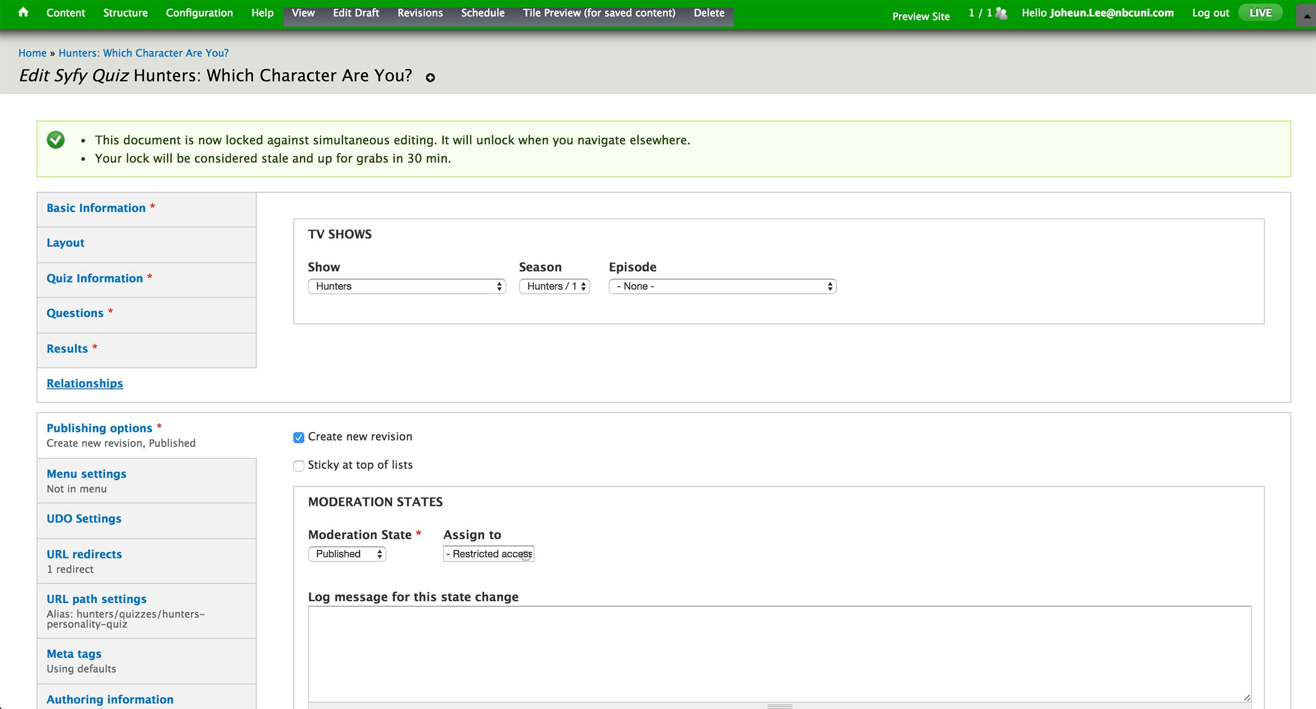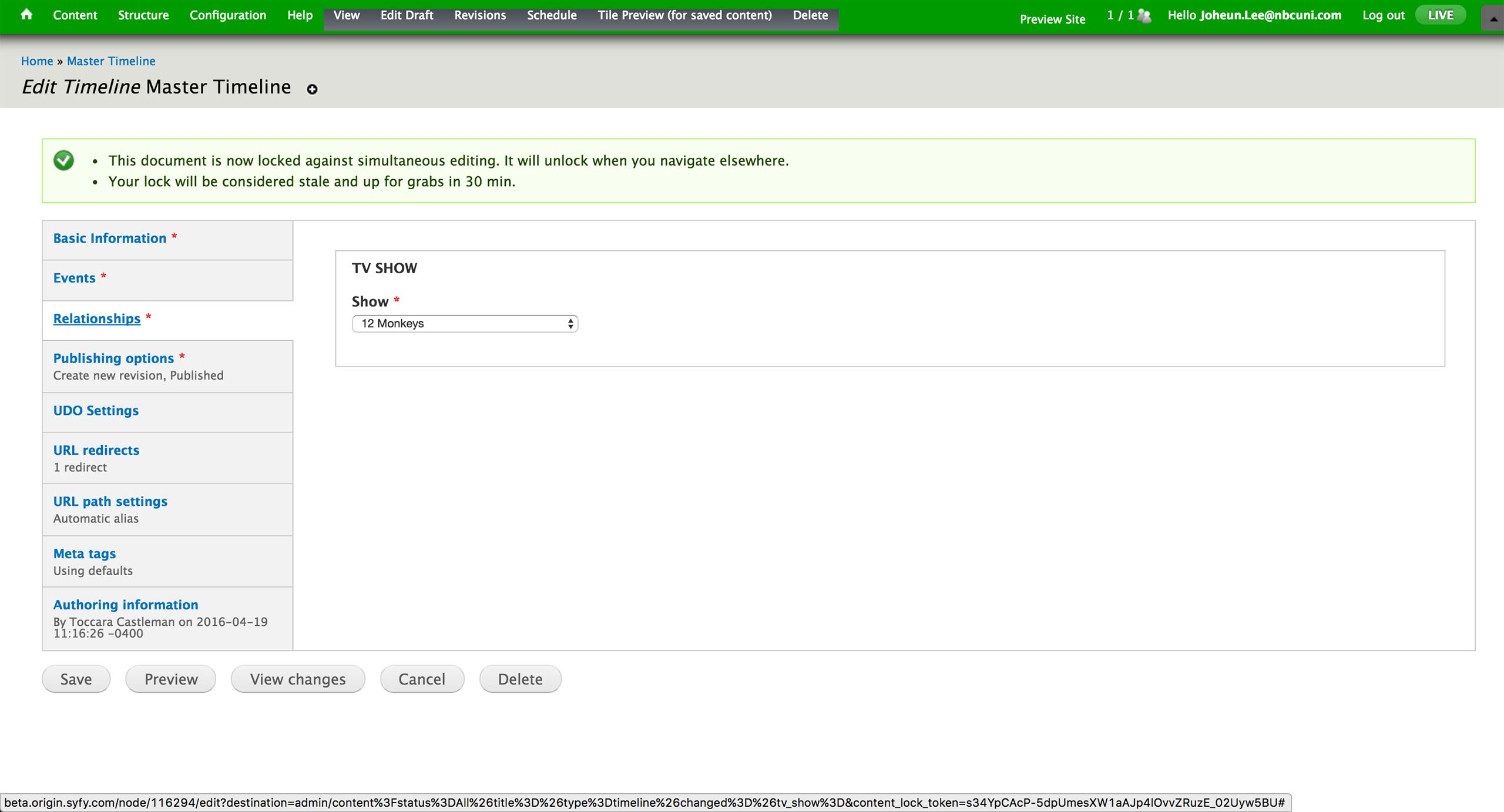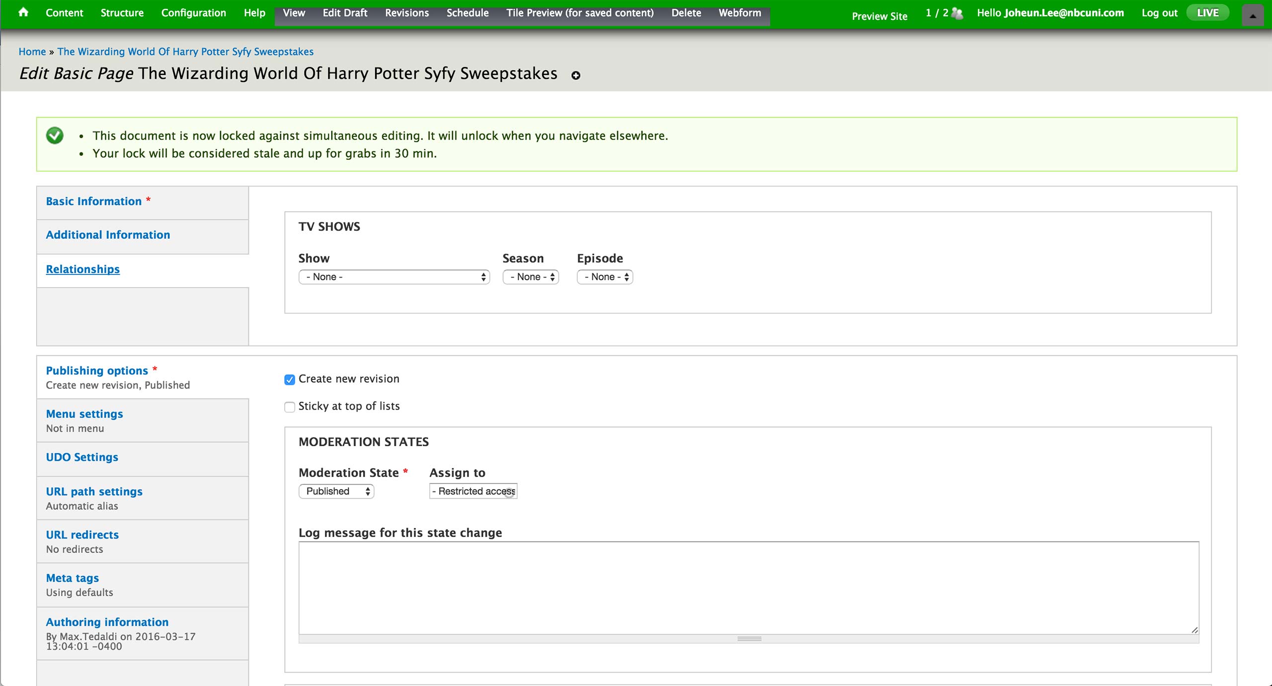 Lastly, the relationship to the show, season, episode is set in the Relationships tab if the page is associated with a specific show in Syfy.