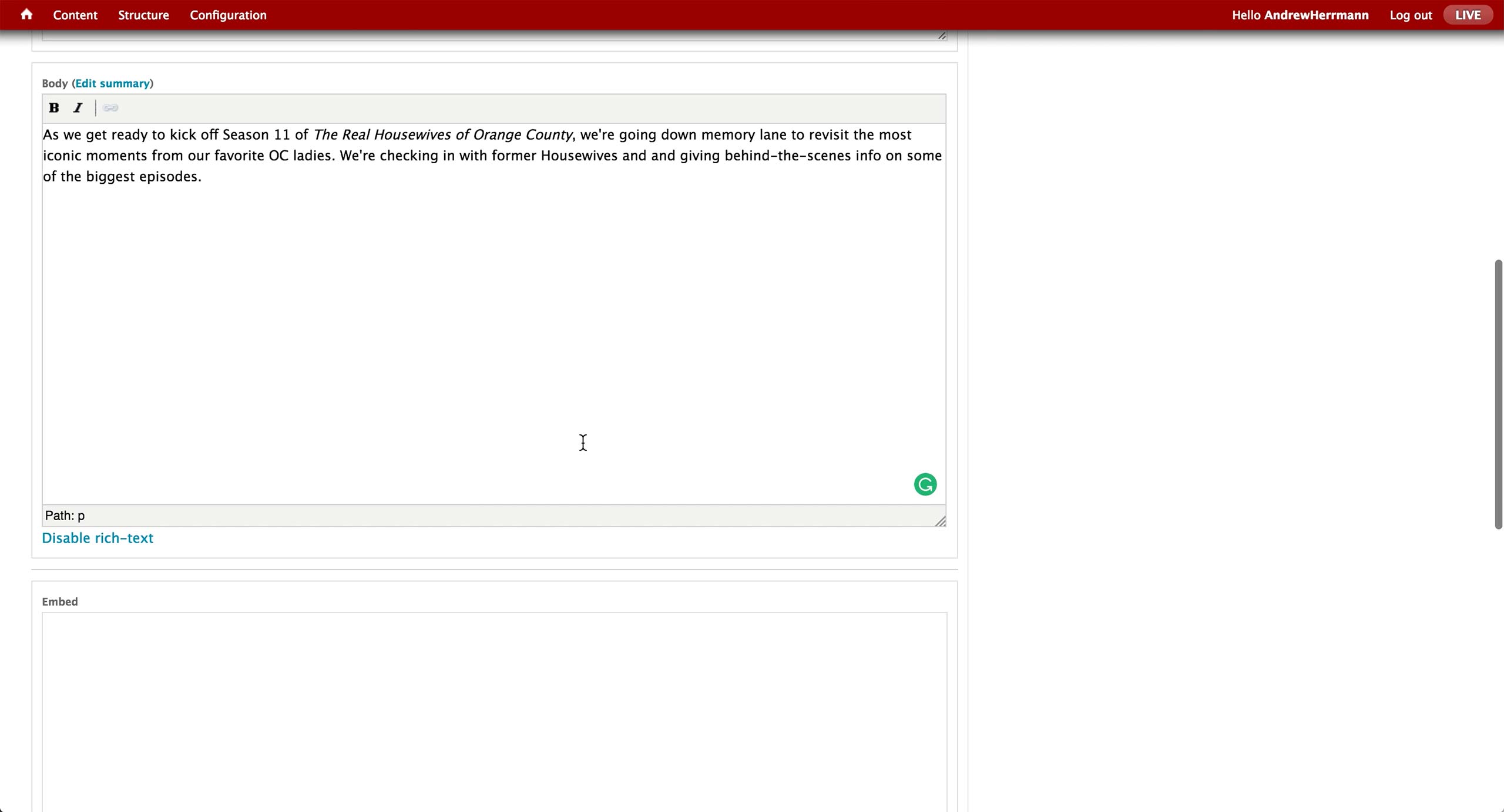 Below the subtitle is the body text area, where producer enters the introductory text. There is an Embed text area to copy and paste any embed code to be displayed on the microsite.
