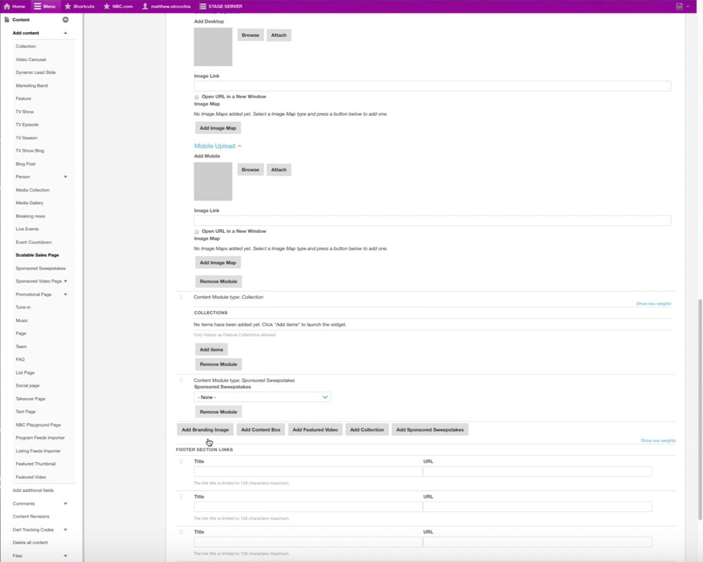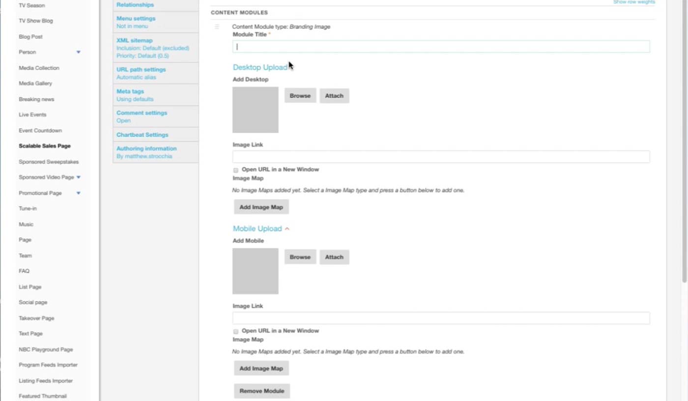 This is the initial screen of the Microsite Content Type in the CMS. On the left, producer enters the title of the microsite and attach images for each of the section. Subtitle appears right below the banner image.