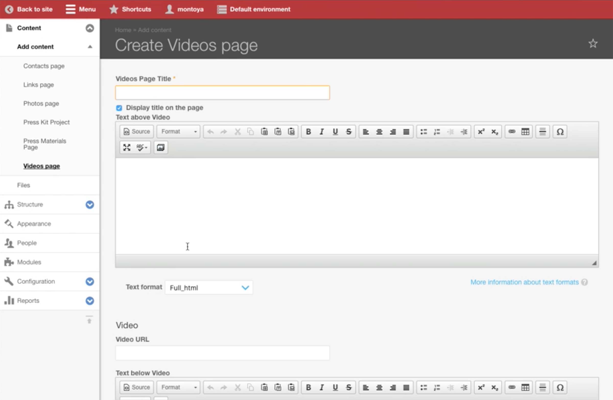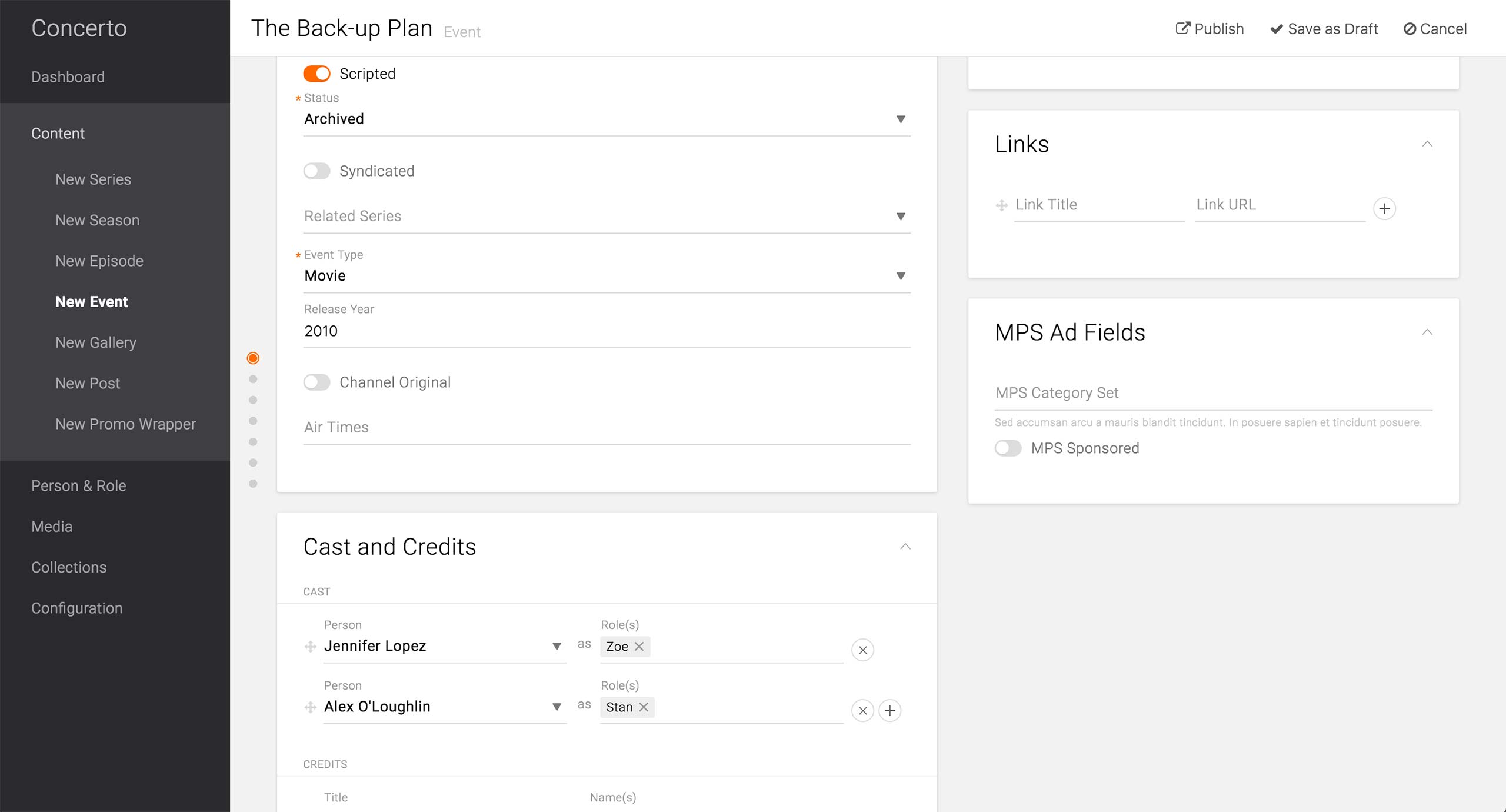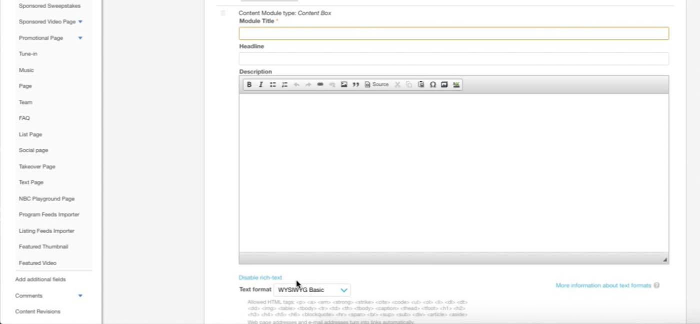 There are standard Title and Description fields, and underneath is the Content Modules section where producers add content in blocks.