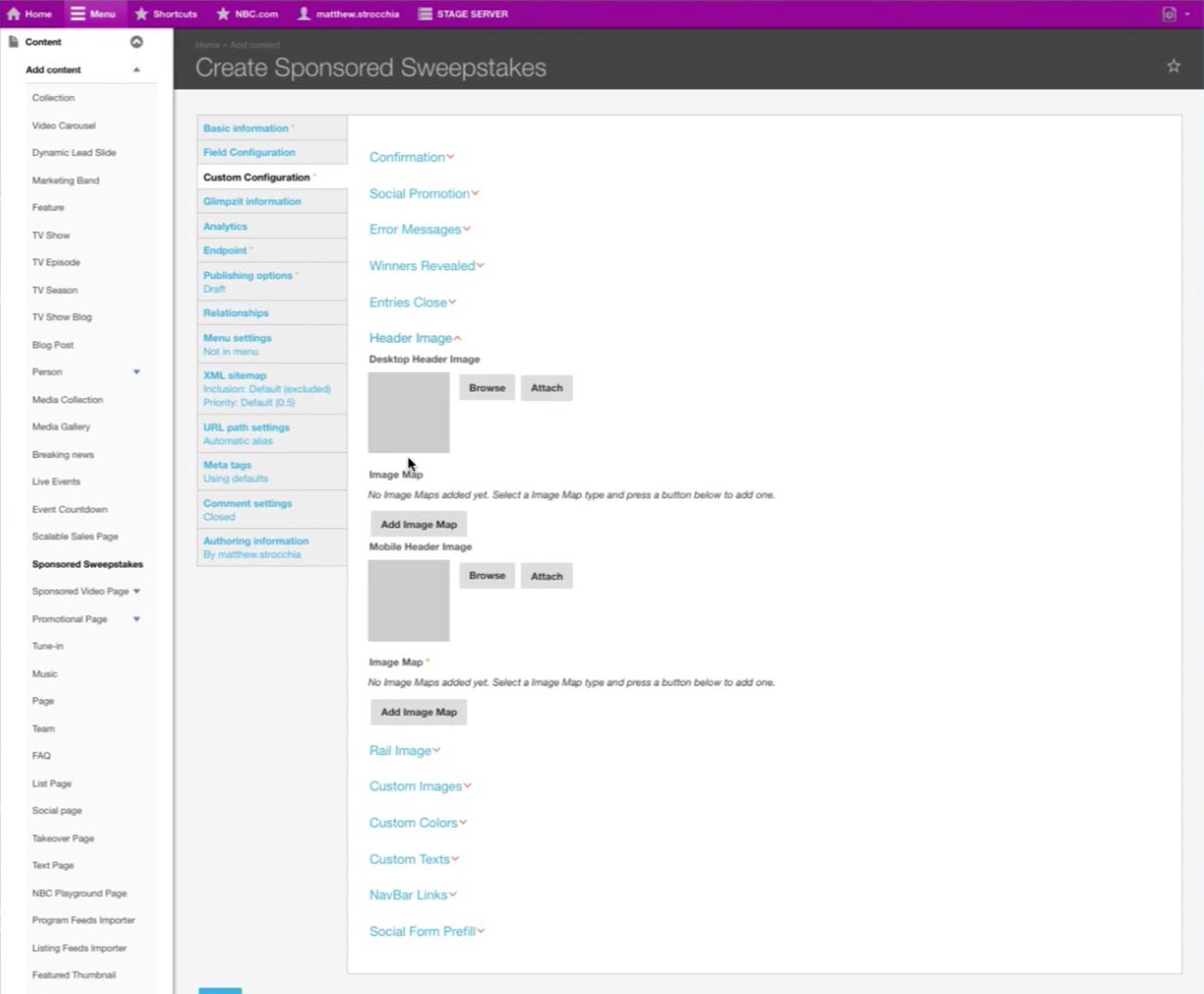 Thus, the unified content type would have a Type selector, which would display additional sections and fields for the navigation and sponsorship upon selecting Microsite option.