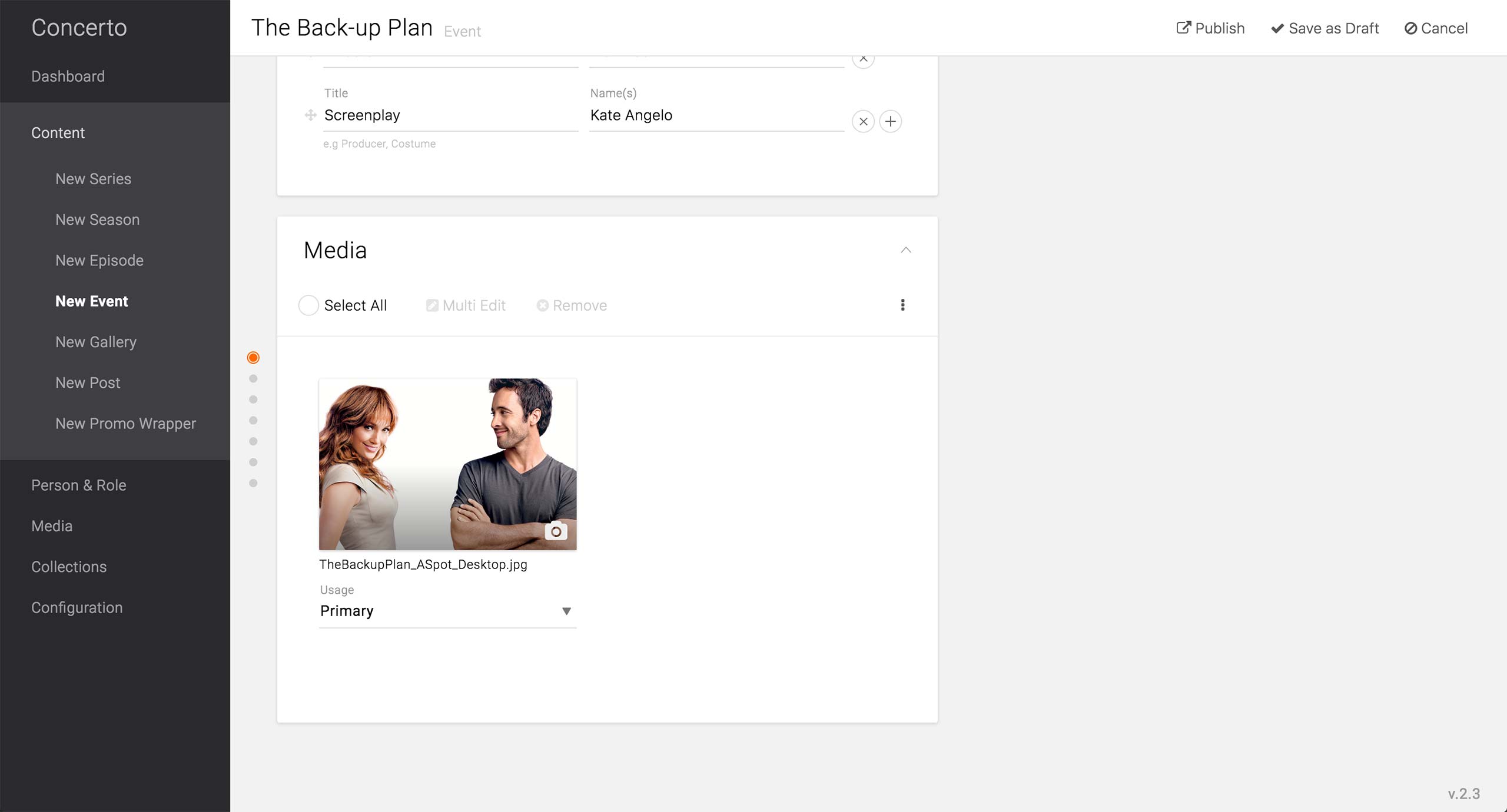 This is the initial screen of the Timeline Content Type. Here, producer sets the title and the cover image of the timeline.