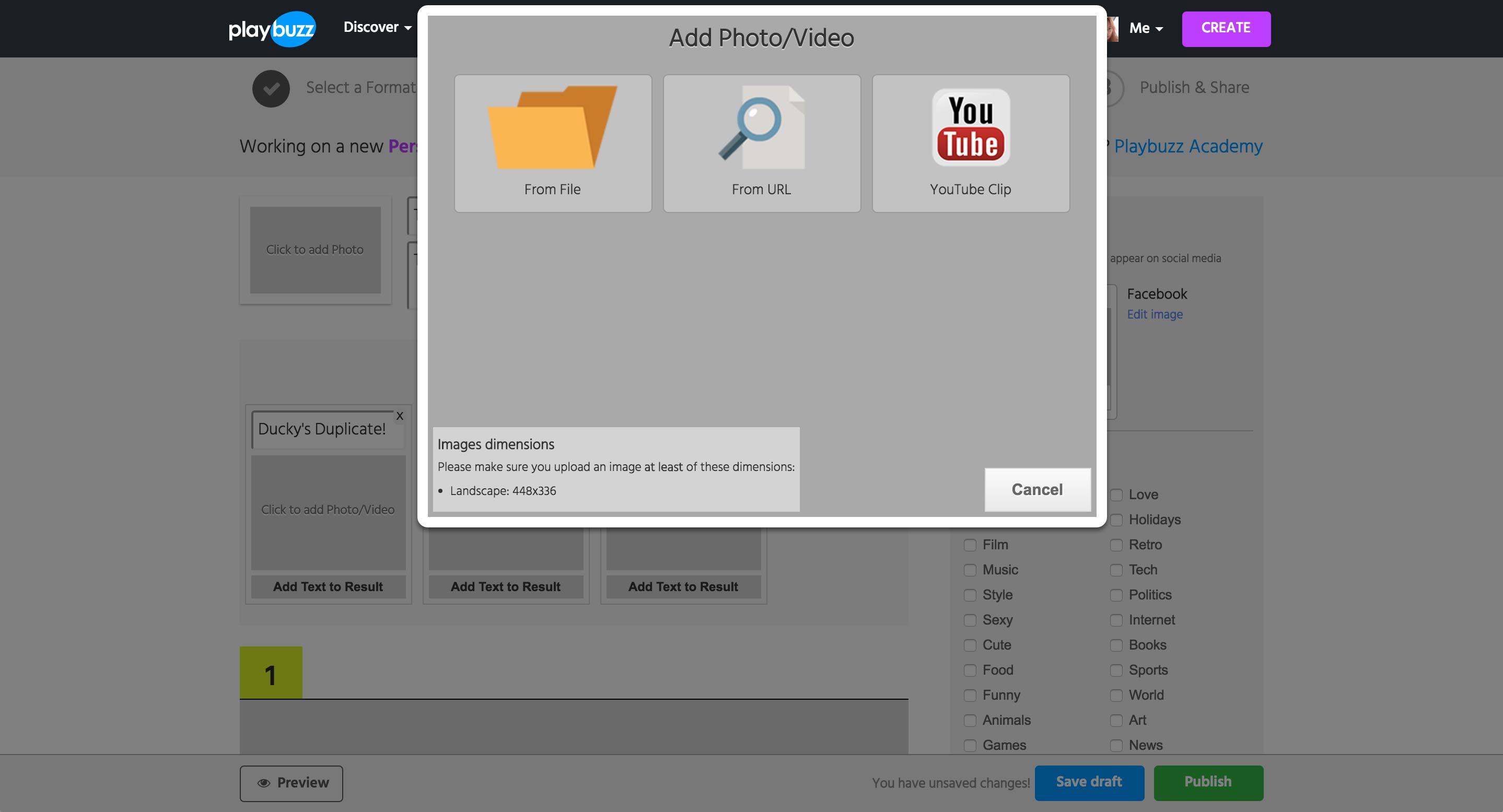 In the Additional Information tab, producer can set the cover photo that appears at the top of the page, as well as the Label that appears above title text. Labels are all pre-defined, and most used labels are SWEEPSTAKES and INFO.