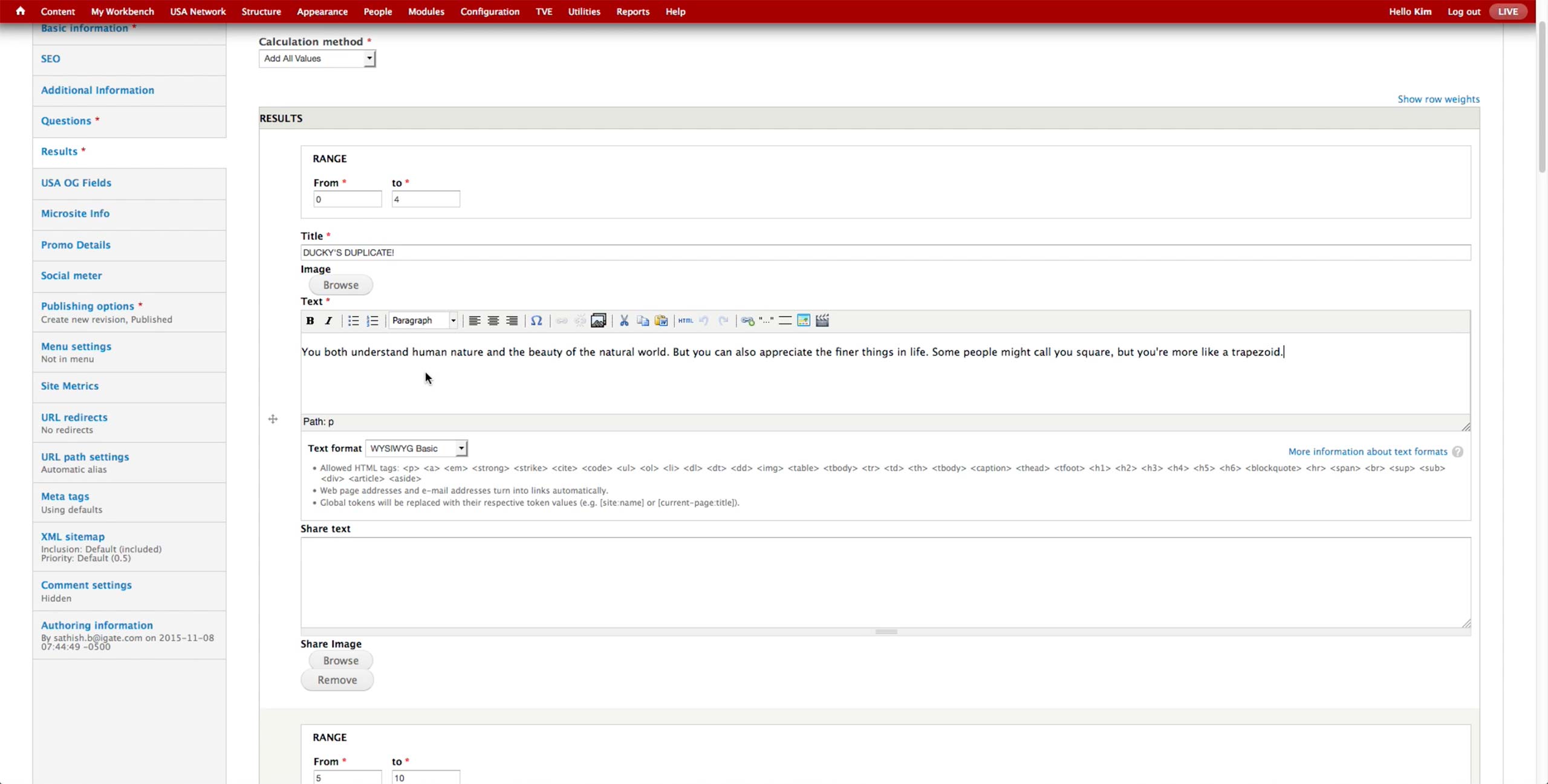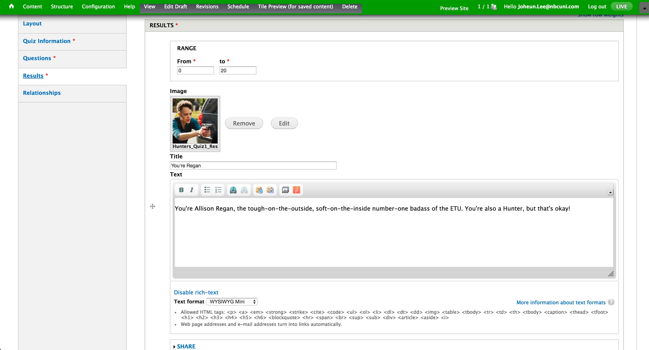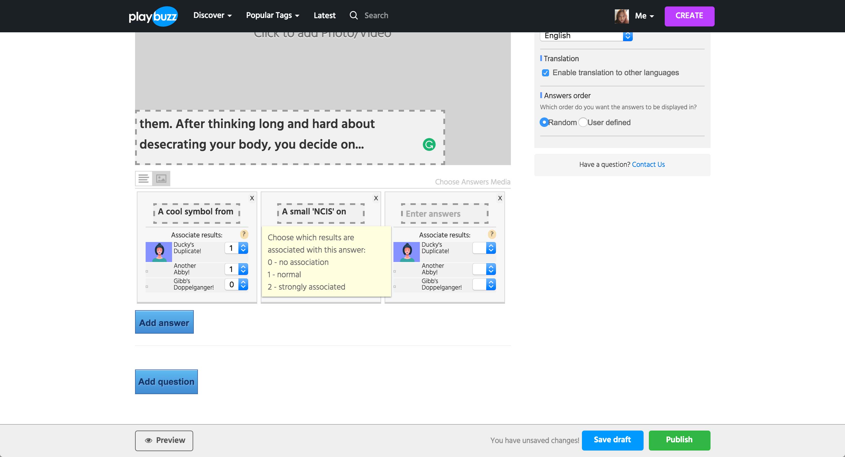 In Personality Quiz, user needs to enter the Results first. Each result can have a title, a media item, and text.