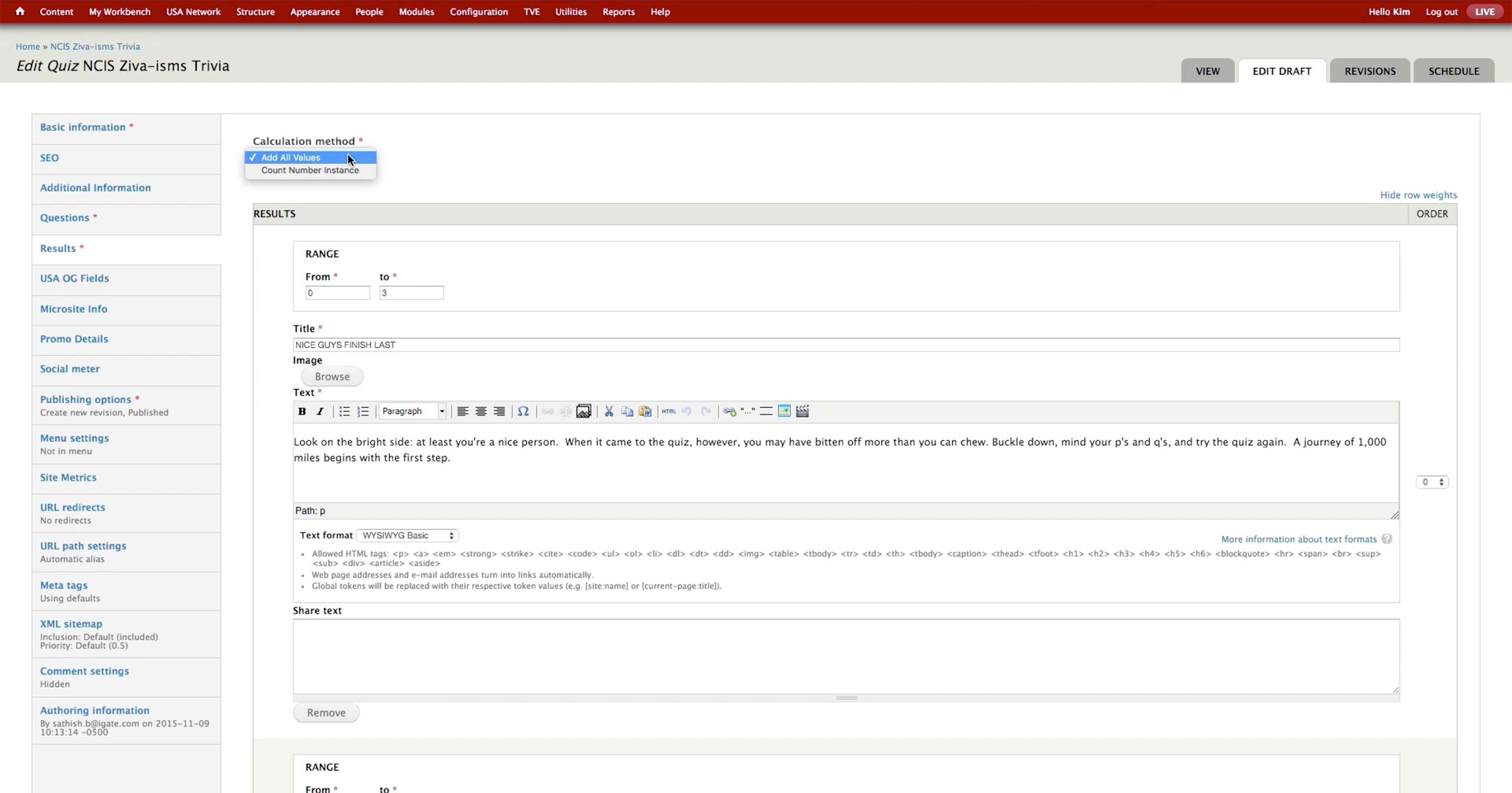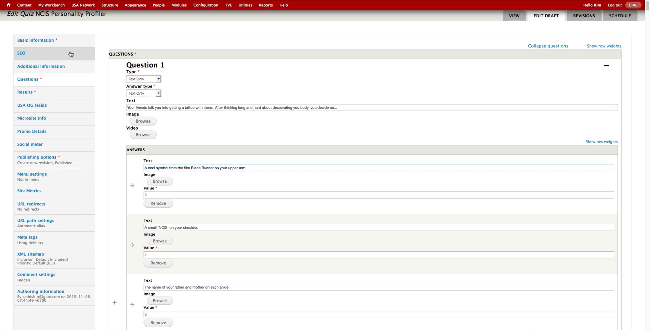 To create a quiz, producer selects to create new Syfy Quiz Content Type. In the Basic Information tab, he sets the title, category, image, and synopsis of the quiz. There are Trivia and Personality quizzes under the Category dropdown. Category, Image and Synopsis appear on the landing page of the quiz.