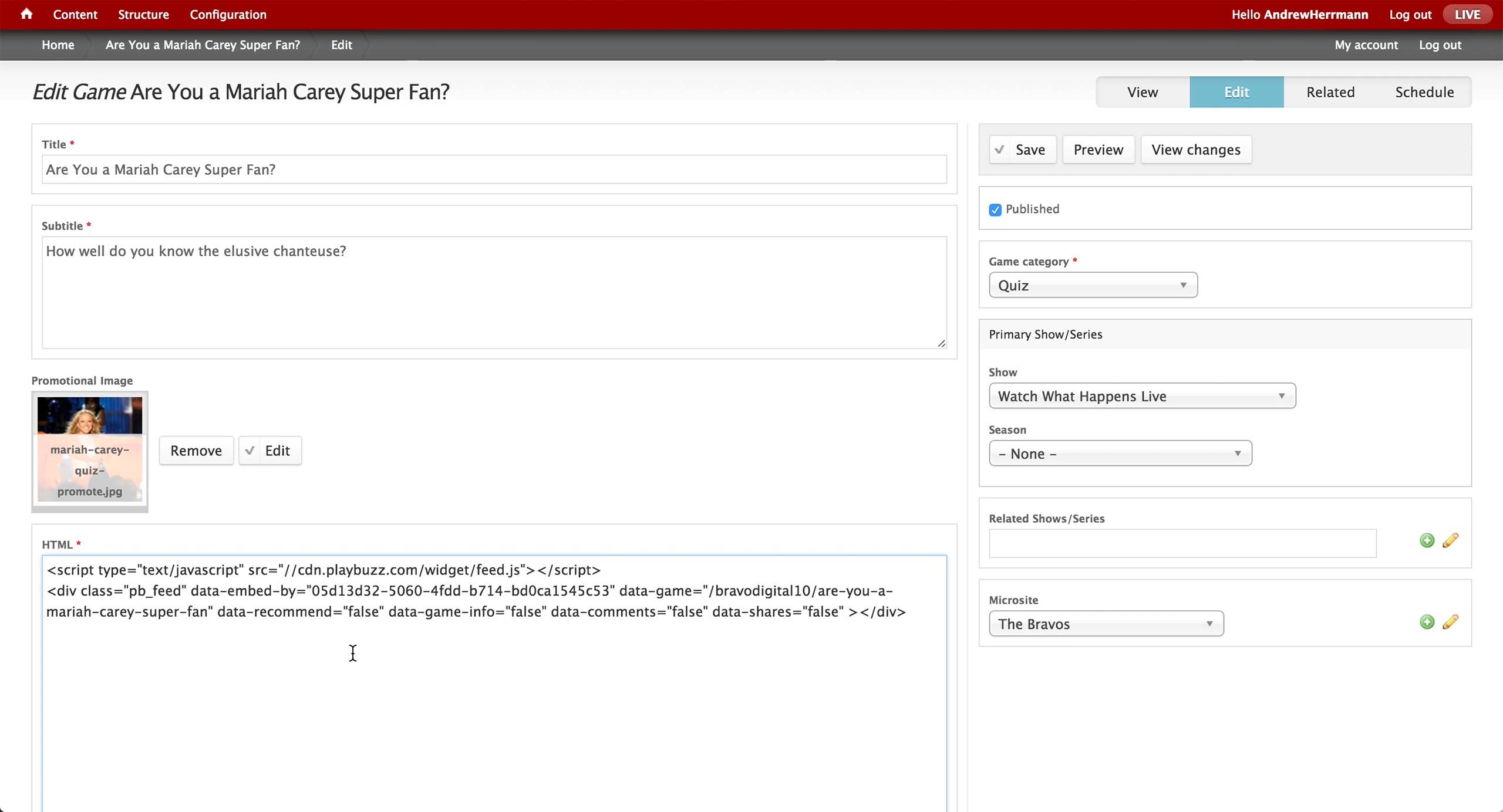In Bravo, quizzes are powered by a 3rd party service called PlayBuzz. The embed code for the quiz simply gets pasted into a separate Game Content Type.