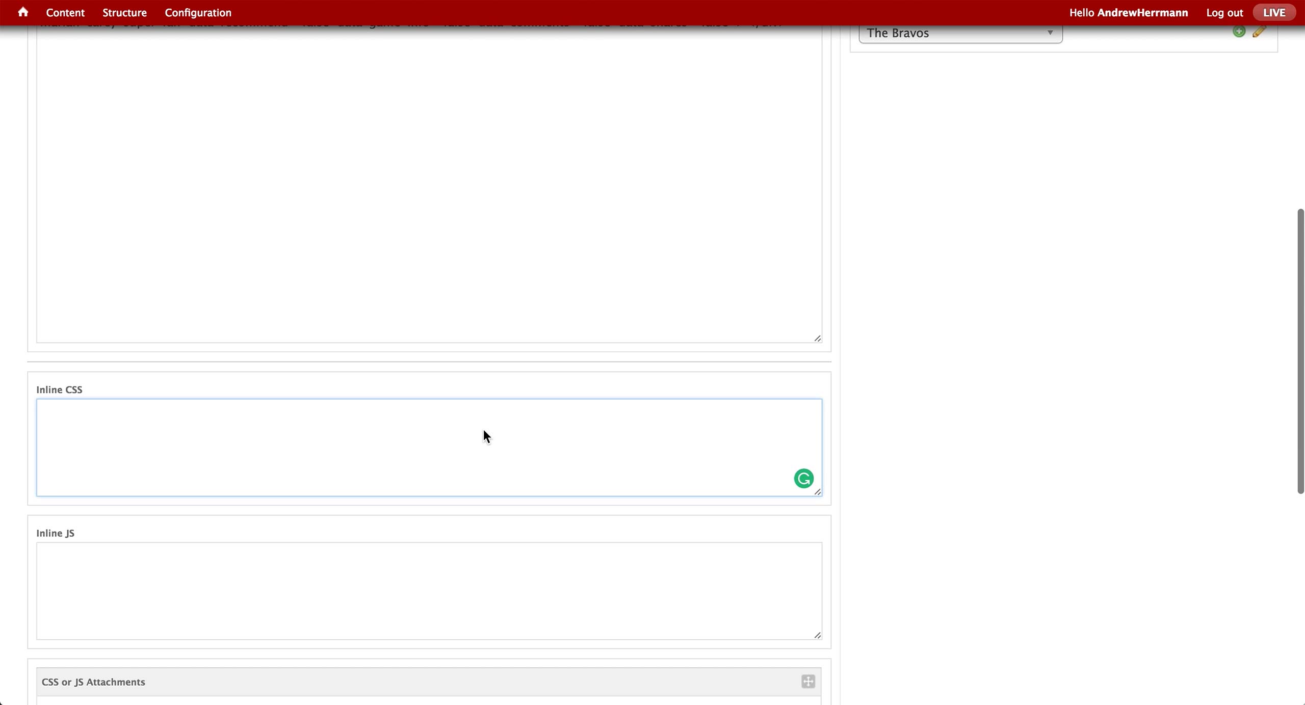 Catchall Code section has three fields for CSS, JavaScript, and HTML code. Producer receives code from designers and programmers and pastes the code in the separate boxes.