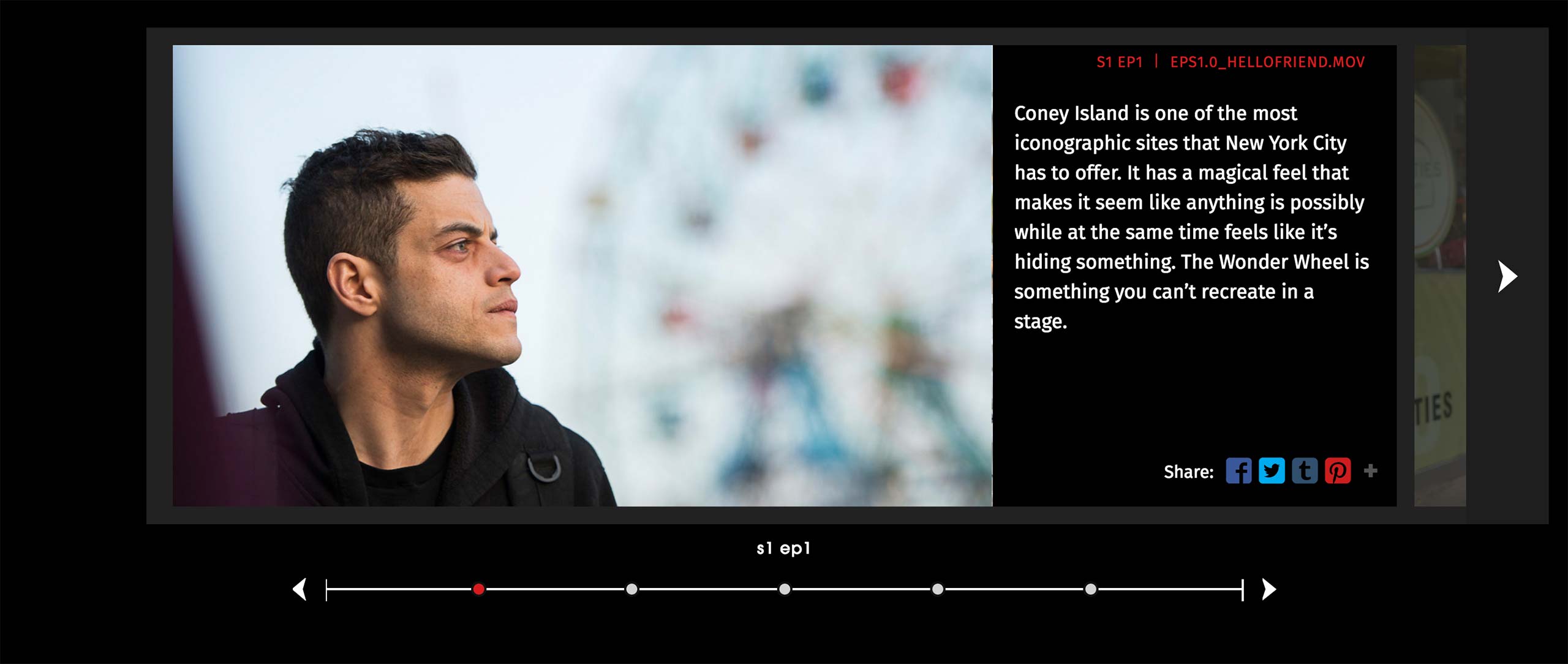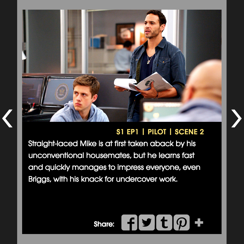 Timeline Gallery shows events from a show in chronological order of the episodes. Content is consisted of text and an image or a video, and user can use the arrows or the bottom navigation to jump through the scenes and episodes.