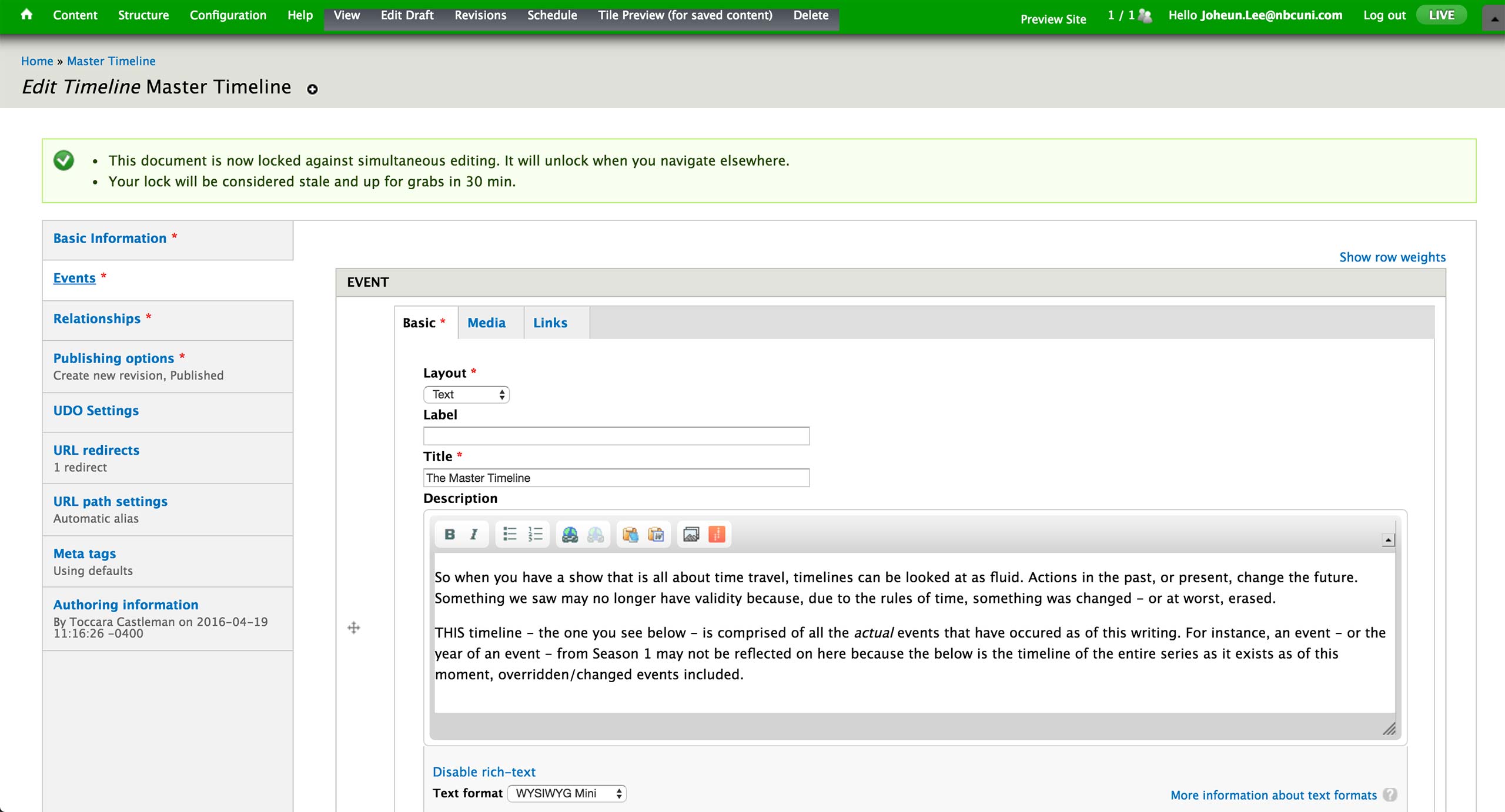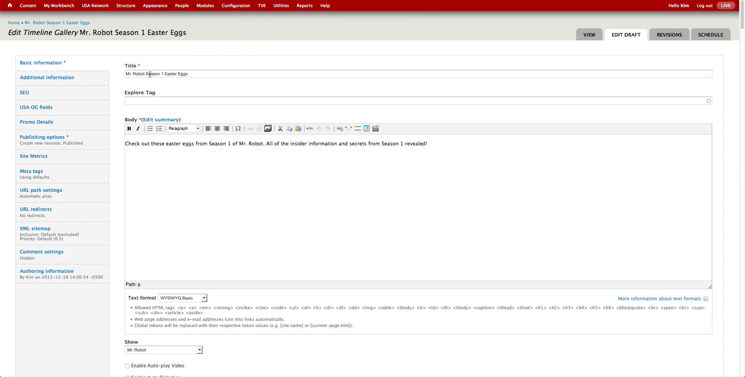 When creating a new Timeline Gallery, producer enters Title, Body text, and Show relationship. The Body text isn’t displayed in the current website design of USA, but it is used as the SEO description.