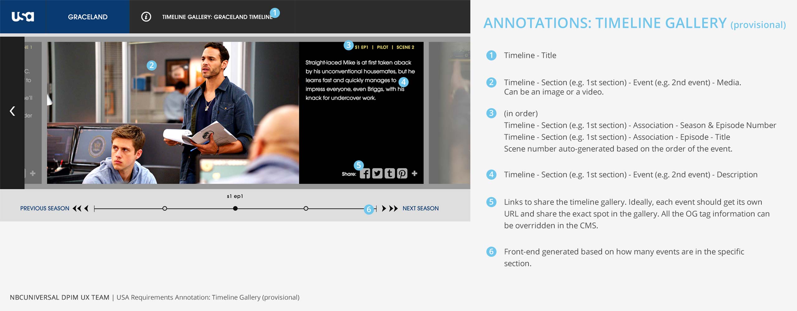 We identified that the Timeline should be able to generate a timeline with text, image, and/or videos. It would also be able to section off the items, e.g. by season or by the year of the event, have custom titles and season/episode association for each item.