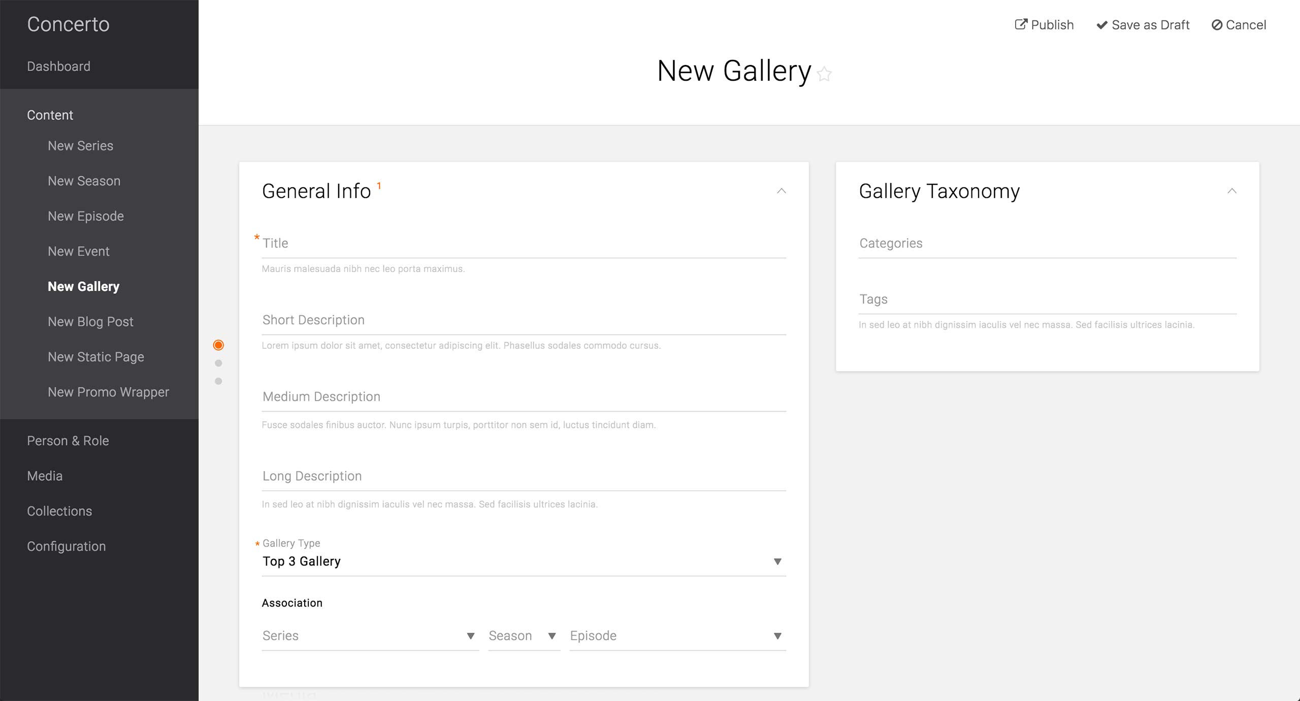 Process of creating the gallery is similar to Timeline Gallery; producer sets the Title and Body first.